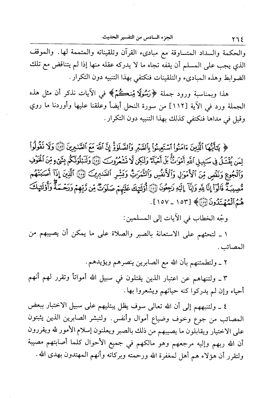 يا أَيُّهَا الَّذِينَ آمَنُوا اسْتَعِينُوا بِالصَّبْرِ وَالصَّلاةِ إِنَّ اللَّهَ مَعَ الصَّابِرِينَ (153) وَلا تَقُولُوا لِمَنْ يُقْتَلُ فِي سَبِيلِ اللَّهِ أَمْواتٌ بَلْ أَحْياءٌ وَلكِنْ لا تَشْعُرُونَ (154) وَلَنَبْلُوَنَّكُمْ بِشَيْءٍ مِنَ الْخَوْفِ وَالْجُوعِ وَنَقْصٍ مِنَ الْأَمْوالِ وَالْأَنْفُسِ وَالثَّمَراتِ وَبَشِّرِ الصَّابِرِينَ (155) الَّذِينَ إِذا أَصابَتْهُمْ مُصِيبَةٌ قالُوا إِنَّا لِلَّهِ وَإِنَّا إِلَيْهِ راجِعُونَ (156) أُولئِكَ عَلَيْهِمْ صَلَواتٌ مِنْ رَبِّهِمْ وَرَحْمَةٌ وَأُولئِكَ هُمُ الْمُهْتَدُونَ (157)