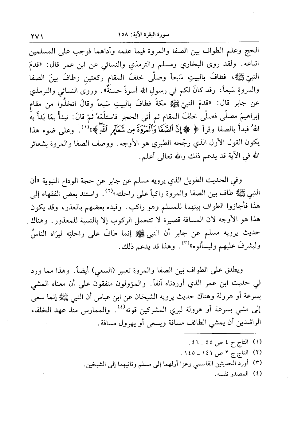 ويطلق على الطواف بين الصفا والمروة تعبير (السعي) أيضا. وهذا مما ورد في حديث ابن عمر الذي أوردناه آنفا. والمؤولون متفقون على أن معناه المشي بسرعة أو هرولة وهناك حديث يرويه الشيخان عن ابن عباس أن النبي صلّى الله عليه وسلّم إنما سعى إلى مشي بسرعة أو هرولة ليري المشركين قوته «4» . والممارس منذ عهد الخلفاء الراشدين أن يمشي الطائف مسافة ويسعى أو يهرول مسافة.