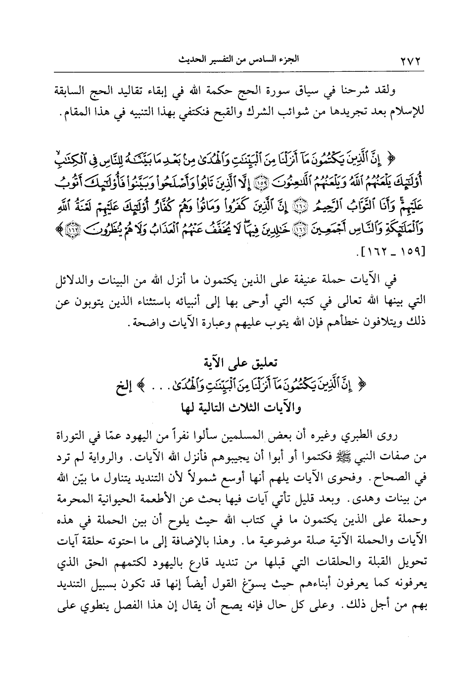 إِنَّ الَّذِينَ يَكْتُمُونَ ما أَنْزَلْنا مِنَ الْبَيِّناتِ وَالْهُدى مِنْ بَعْدِ ما بَيَّنَّاهُ لِلنَّاسِ فِي الْكِتابِ أُولئِكَ يَلْعَنُهُمُ اللَّهُ وَيَلْعَنُهُمُ اللاَّعِنُونَ (159) إِلاَّ الَّذِينَ تابُوا وَأَصْلَحُوا وَبَيَّنُوا فَأُولئِكَ أَتُوبُ عَلَيْهِمْ وَأَنَا التَّوَّابُ الرَّحِيمُ (160) إِنَّ الَّذِينَ كَفَرُوا وَماتُوا وَهُمْ كُفَّارٌ أُولئِكَ عَلَيْهِمْ لَعْنَةُ اللَّهِ وَالْمَلائِكَةِ وَالنَّاسِ أَجْمَعِينَ (161) خالِدِينَ فِيها لا يُخَفَّفُ عَنْهُمُ الْعَذابُ وَلا هُمْ يُنْظَرُونَ (162)