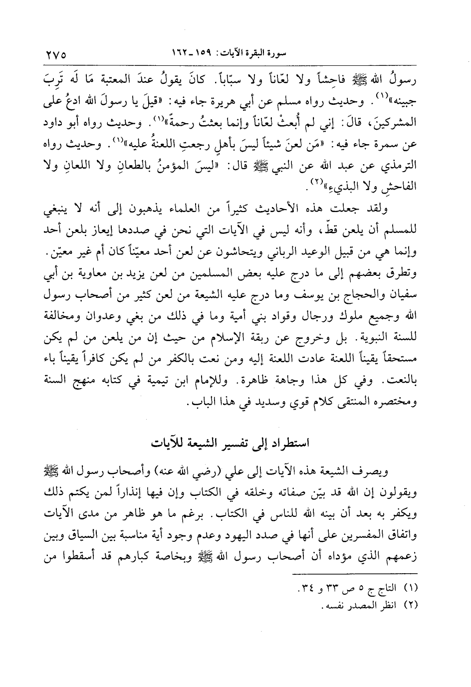 ويصرف الشيعة هذه الآيات إلى علي (رضي الله عنه) وأصحاب رسول الله صلّى الله عليه وسلّم ويقولون إن الله قد بيّن صفاته وخلقه في الكتاب وإن فيها إنذارا لمن يكتم ذلك ويكفر به بعد أن بينه الله للناس في الكتاب. برغم ما هو ظاهر من مدى الآيات واتفاق المفسرين على أنها في صدد اليهود وعدم وجود أية مناسبة بين السياق وبين زعمهم الذي مؤداه أن أصحاب رسول الله صلّى الله عليه وسلّم وبخاصة كبارهم قد أسقطوا من