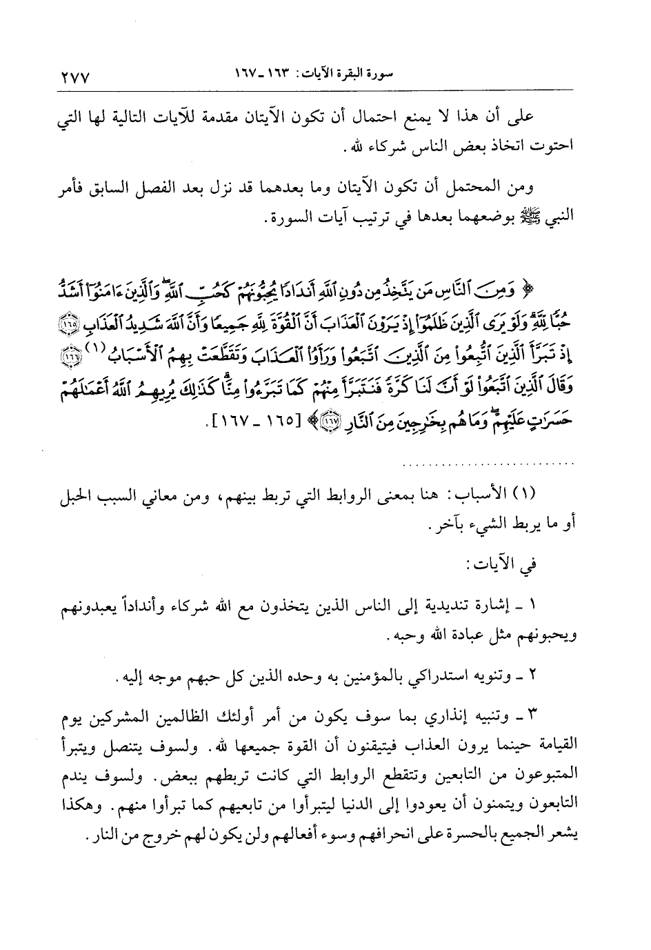 وَمِنَ النَّاسِ مَنْ يَتَّخِذُ مِنْ دُونِ اللَّهِ أَنْداداً يُحِبُّونَهُمْ كَحُبِّ اللَّهِ وَالَّذِينَ آمَنُوا أَشَدُّ حُبًّا لِلَّهِ وَلَوْ يَرَى الَّذِينَ ظَلَمُوا إِذْ يَرَوْنَ الْعَذابَ أَنَّ الْقُوَّةَ لِلَّهِ جَمِيعاً وَأَنَّ اللَّهَ شَدِيدُ الْعَذابِ (165) إِذْ تَبَرَّأَ الَّذِينَ اتُّبِعُوا مِنَ الَّذِينَ اتَّبَعُوا وَرَأَوُا الْعَذابَ وَتَقَطَّعَتْ بِهِمُ الْأَسْبابُ (166) وَقالَ الَّذِينَ اتَّبَعُوا لَوْ أَنَّ لَنا كَرَّةً فَنَتَبَرَّأَ مِنْهُمْ كَما تَبَرَّؤُا مِنَّا كَذلِكَ يُرِيهِمُ اللَّهُ أَعْمالَهُمْ حَسَراتٍ عَلَيْهِمْ وَما هُمْ بِخارِجِينَ مِنَ النَّارِ (167)