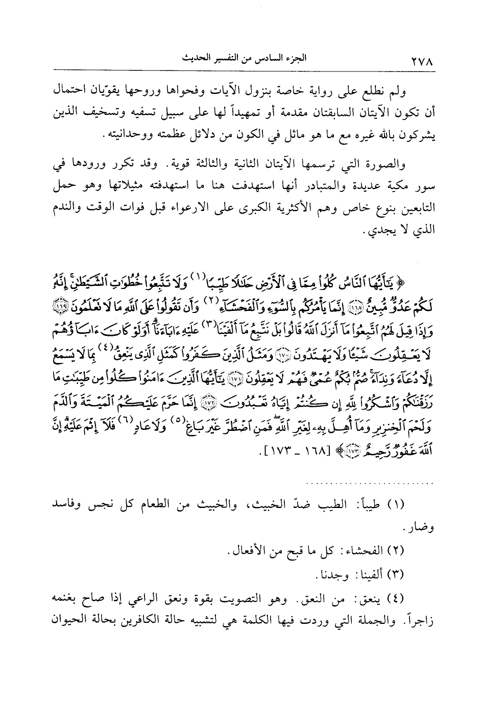 يا أَيُّهَا النَّاسُ كُلُوا مِمَّا فِي الْأَرْضِ حَلالاً طَيِّباً وَلا تَتَّبِعُوا خُطُواتِ الشَّيْطانِ إِنَّهُ لَكُمْ عَدُوٌّ مُبِينٌ (168) إِنَّما يَأْمُرُكُمْ بِالسُّوءِ وَالْفَحْشاءِ وَأَنْ تَقُولُوا عَلَى اللَّهِ ما لا تَعْلَمُونَ (169) وَإِذا قِيلَ لَهُمُ اتَّبِعُوا ما أَنْزَلَ اللَّهُ قالُوا بَلْ نَتَّبِعُ ما أَلْفَيْنا عَلَيْهِ آباءَنا أَوَلَوْ كانَ آباؤُهُمْ لا يَعْقِلُونَ شَيْئاً وَلا يَهْتَدُونَ (170) وَمَثَلُ الَّذِينَ كَفَرُوا كَمَثَلِ الَّذِي يَنْعِقُ بِما لا يَسْمَعُ إِلاَّ دُعاءً وَنِداءً صُمٌّ بُكْمٌ عُمْيٌ فَهُمْ لا يَعْقِلُونَ (171) يا أَيُّهَا الَّذِينَ آمَنُوا كُلُوا مِنْ طَيِّباتِ ما رَزَقْناكُمْ وَاشْكُرُوا لِلَّهِ إِنْ كُنْتُمْ إِيَّاهُ تَعْبُدُونَ (172)