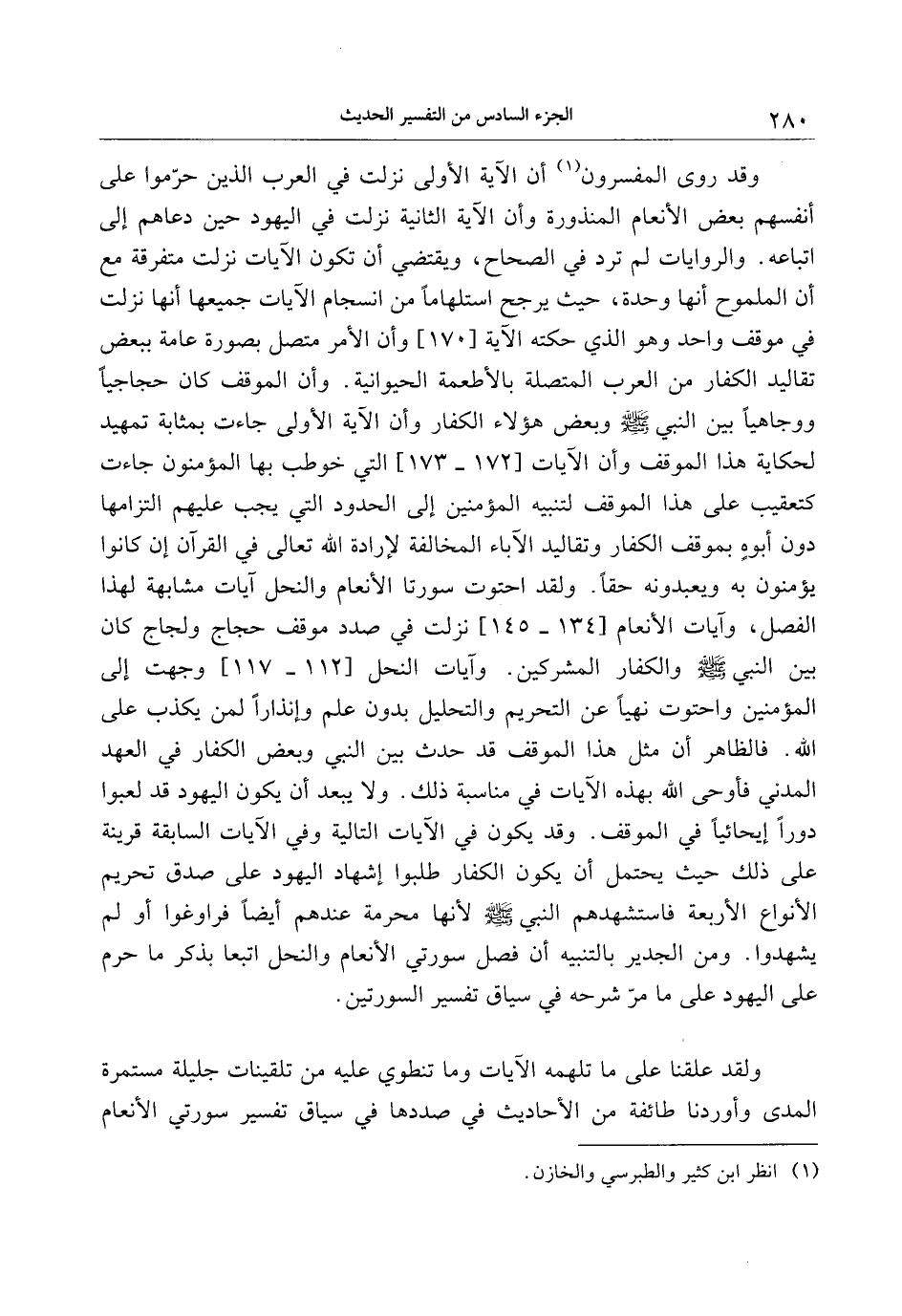 وقد روى المفسرون «1» أن الآية الأولى نزلت في العرب الذين حرّموا على أنفسهم بعض الأنعام المنذورة وأن الآية الثانية نزلت في اليهود حين دعاهم إلى اتباعه. والروايات لم ترد في الصحاح، ويقتضي أن تكون الآيات نزلت متفرقة مع أن الملموح أنها وحدة، حيث يرجح استلهاما من انسجام الآيات جميعها أنها نزلت في موقف واحد وهو الذي حكته الآية [170] وأن الأمر متصل بصورة عامة ببعض تقاليد الكفار من العرب المتصلة بالأطعمة الحيوانية. وأن الموقف كان حجاجيا ووجاهيا بين النبي صلّى الله عليه وسلّم وبعض هؤلاء الكفار وأن الآية الأولى جاءت بمثابة تمهيد لحكاية هذا الموقف وأن الآيات [172- 173] التي خوطب بها المؤمنون جاءت كتعقيب على هذا الموقف لتنبيه المؤمنين إلى الحدود التي يجب عليهم التزامها دون أبوه بموقف الكفار وتقاليد الآباء المخالفة لإرادة الله تعالى في القرآن إن كانوا يؤمنون به ويعبدونه حقا. ولقد احتوت سورتا الأنعام والنحل آيات مشابهة لهذا الفصل، وآيات الأنعام [134- 145] نزلت في صدد موقف حجاج ولجاج كان بين النبي صلّى الله عليه وسلّم والكفار المشركين. وآيات النحل [112- 117] وجهت إلى المؤمنين واحتوت نهيا عن التحريم والتحليل بدون علم وإنذارا لمن يكذب على الله. فالظاهر أن مثل هذا الموقف قد حدث بين النبي وبعض الكفار في العهد المدني فأوحى الله بهذه الآيات في مناسبة ذلك. ولا يبعد أن يكون اليهود قد لعبوا دورا إيحائيا في الموقف. وقد يكون في الآيات التالية وفي الآيات السابقة قرينة على ذلك حيث يحتمل أن يكون الكفار طلبوا إشهاد اليهود على صدق تحريم الأنواع الأربعة فاستشهدهم النبي صلّى الله عليه وسلّم لأنها محرمة عندهم أيضا فراوغوا أو لم يشهدوا. ومن الجدير بالتنبيه أن فصل سورتي الأنعام والنحل اتبعا بذكر ما حرم على اليهود على ما مرّ شرحه في سياق تفسير السورتين.