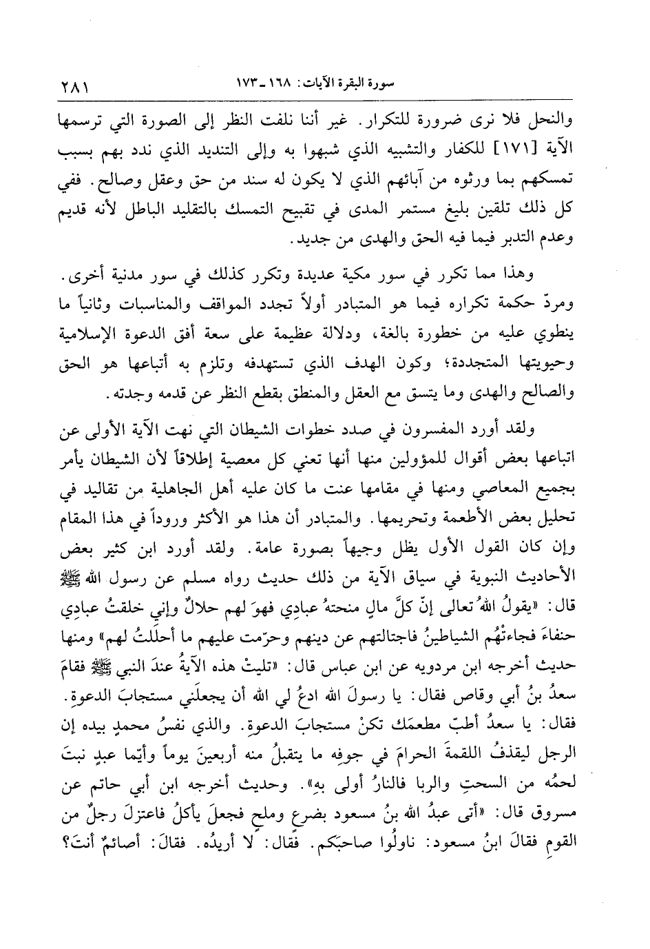 ولقد أورد المفسرون في صدد خطوات الشيطان التي نهت الآية الأولى عن اتباعها بعض أقوال للمؤولين منها أنها تعني كل معصية إطلاقا لأن الشيطان يأمر بجميع المعاصي ومنها في مقامها عنت ما كان عليه أهل الجاهلية من تقاليد في تحليل بعض الأطعمة وتحريمها. والمتبادر أن هذا هو الأكثر ورودا في هذا المقام وإن كان القول الأول يظل وجيها بصورة عامة. ولقد أورد ابن كثير بعض الأحاديث النبوية في سياق الآية من ذلك حديث رواه مسلم عن رسول الله صلّى الله عليه وسلّم قال: «يقول الله تعالى إنّ كلّ مال منحته عبادي فهو لهم حلال وإني خلقت عبادي حنفاء فجاءتهم الشياطين فاجتالتهم عن دينهم وحرّمت عليهم ما أحللت لهم» ومنها حديث أخرجه ابن مردويه عن ابن عباس قال: «تليت هذه الآية عند النبي صلّى الله عليه وسلّم فقام سعد بن أبي وقاص فقال: يا رسول الله ادع لي الله أن يجعلني مستجاب الدعوة.