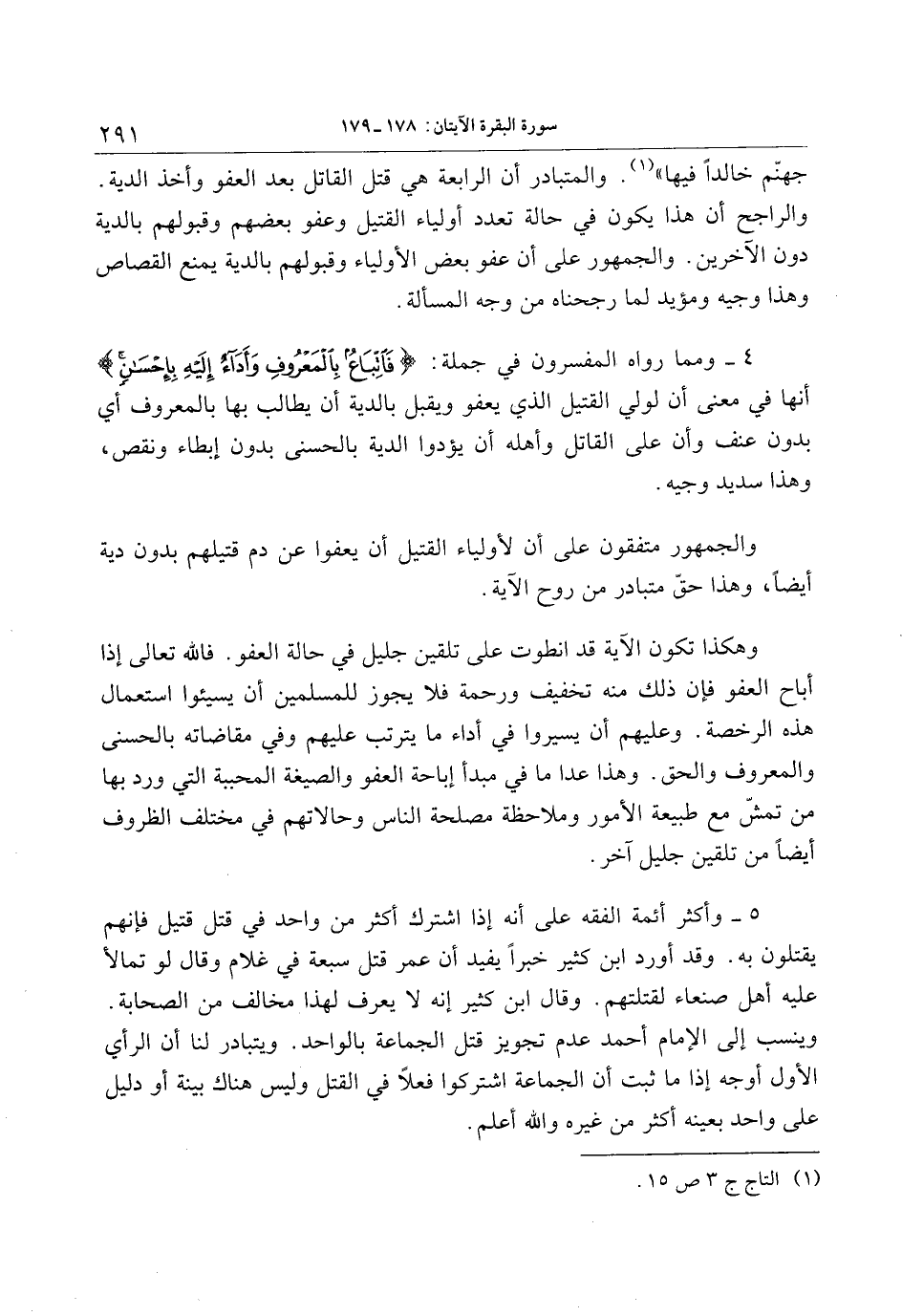 4- ومما رواه المفسرون في جملة: فَاتِّباعٌ بِالْمَعْرُوفِ وَأَداءٌ إِلَيْهِ بِإِحْسانٍ أنها في معنى أن لولي القتيل الذي يعفو ويقبل بالدية أن يطالب بها بالمعروف أي بدون عنف وأن على القاتل وأهله أن يؤدوا الدية بالحسنى بدون إبطاء ونقص، وهذا سديد وجيه.