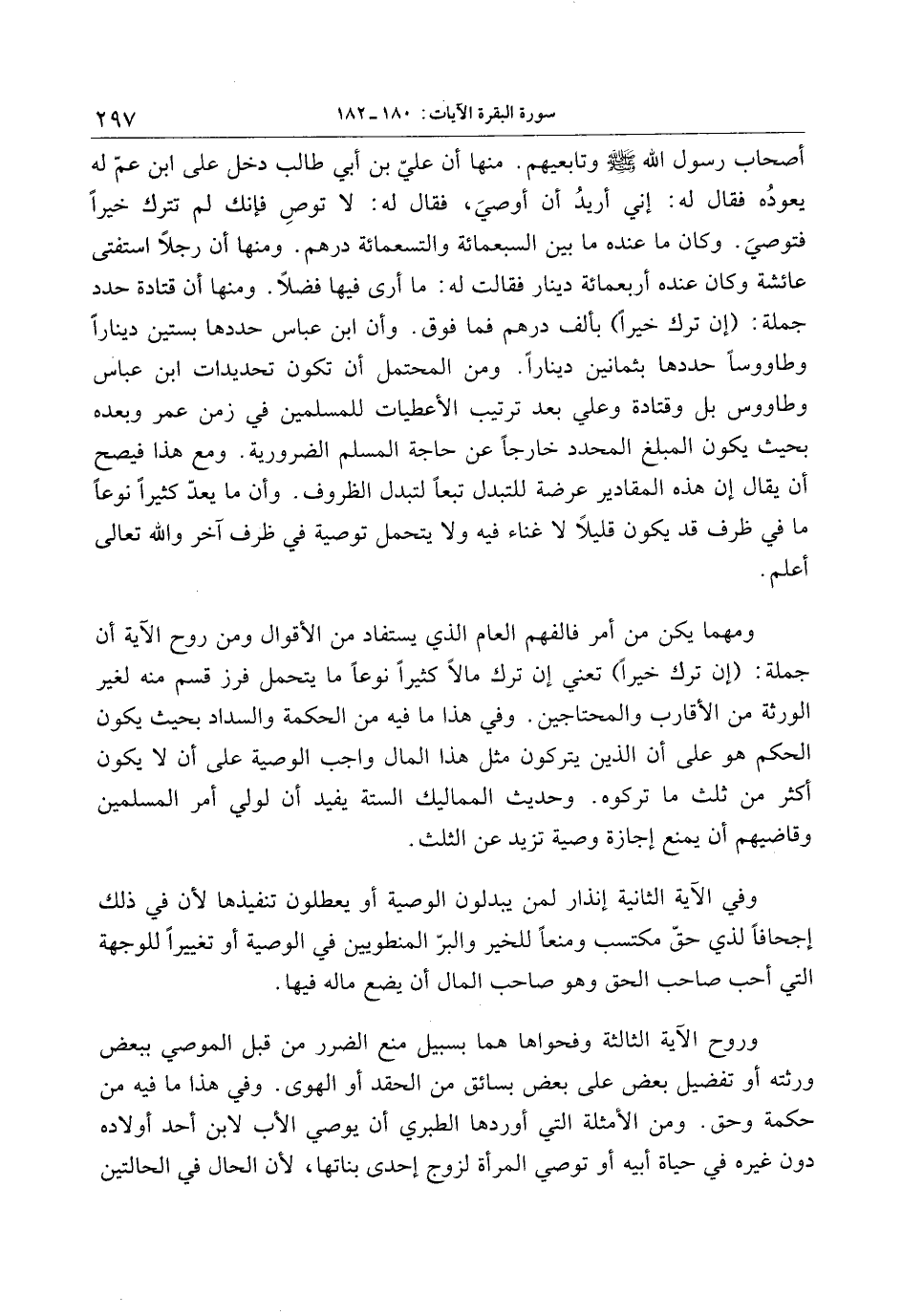 أصحاب رسول الله صلّى الله عليه وسلّم وتابعيهم. منها أن عليّ بن أبي طالب دخل على ابن عمّ له يعوده فقال له: إني أريد أن أوصي، فقال له: لا توص فإنك لم تترك خيرا فتوصي. وكان ما عنده ما بين السبعمائة والتسعمائة درهم. ومنها أن رجلا استفتى عائشة وكان عنده أربعمائة دينار فقالت له: ما أرى فيها فضلا. ومنها أن قتادة حدد جملة: (إن ترك خيرا) بألف درهم فما فوق. وأن ابن عباس حددها بستين دينارا وطاووسا حددها بثمانين دينارا. ومن المحتمل أن تكون تحديدات ابن عباس وطاووس بل وقتادة وعلي بعد ترتيب الأعطيات للمسلمين في زمن عمر وبعده بحيث يكون المبلغ المحدد خارجا عن حاجة المسلم الضرورية. ومع هذا فيصح أن يقال إن هذه المقادير عرضة للتبدل تبعا لتبدل الظروف. وأن ما يعدّ كثيرا نوعا ما في ظرف قد يكون قليلا لا غناء فيه ولا يتحمل توصية في ظرف آخر والله تعالى أعلم.