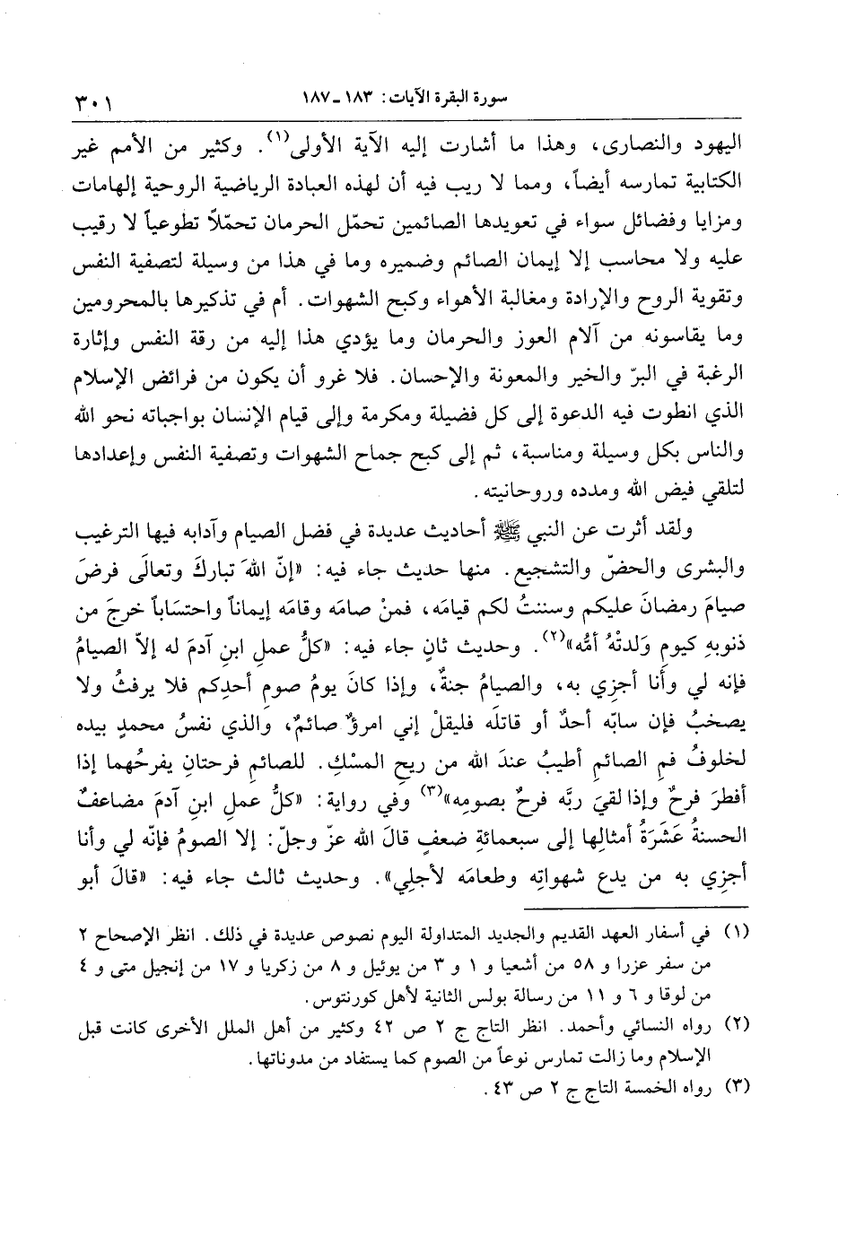 اليهود والنصارى، وهذا ما أشارت إليه الآية الأولى «1» . وكثير من الأمم غير الكتابية تمارسه أيضا، ومما لا ريب فيه أن لهذه العبادة الرياضية الروحية إلهامات ومزايا وفضائل سواء في تعويدها الصائمين تحمّل الحرمان تحمّلا تطوعيا لا رقيب عليه ولا محاسب إلا إيمان الصائم وضميره وما في هذا من وسيلة لتصفية النفس وتقوية الروح والإرادة ومغالبة الأهواء وكبح الشهوات. أم في تذكيرها بالمحرومين وما يقاسونه من آلام العوز والحرمان وما يؤدي هذا إليه من رقة النفس وإثارة الرغبة في البرّ والخير والمعونة والإحسان. فلا غرو أن يكون من فرائض الإسلام الذي انطوت فيه الدعوة إلى كل فضيلة ومكرمة وإلى قيام الإنسان بواجباته نحو الله والناس بكل وسيلة ومناسبة، ثم إلى كبح جماح الشهوات وتصفية النفس وإعدادها لتلقي فيض الله ومدده وروحانيته.