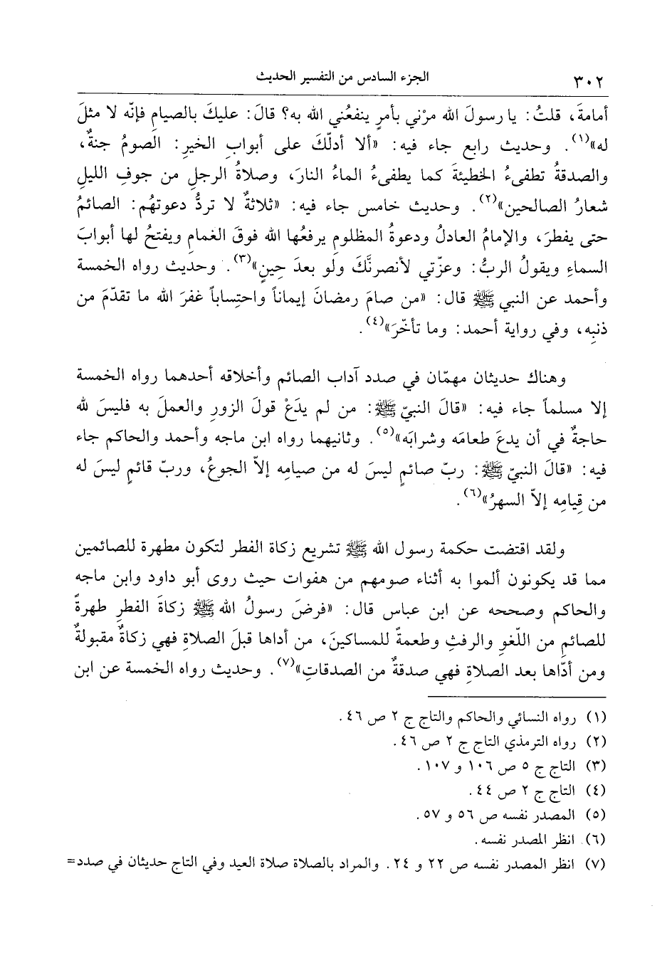 أمامة، قلت: يا رسول الله مرني بأمر ينفعني الله به؟ قال: عليك بالصيام فإنّه لا مثل له» «1» . وحديث رابع جاء فيه: «ألا أدلّك على أبواب الخير: الصوم جنة، والصدقة تطفئ الخطيئة كما يطفىء الماء النار، وصلاة الرجل من جوف الليل شعار الصالحين» «2» . وحديث خامس جاء فيه: «ثلاثة لا تردّ دعوتهم: الصائم حتى يفطر، والإمام العادل ودعوة المظلوم يرفعها الله فوق الغمام ويفتح لها أبواب السماء ويقول الربّ: وعزّتي لأنصرنّك ولو بعد حين» «3» . وحديث رواه الخمسة وأحمد عن النبي صلّى الله عليه وسلّم قال: «من صام رمضان إيمانا واحتسابا غفر الله ما تقدّم من ذنبه، وفي رواية أحمد: وما تأخّر» «4» .