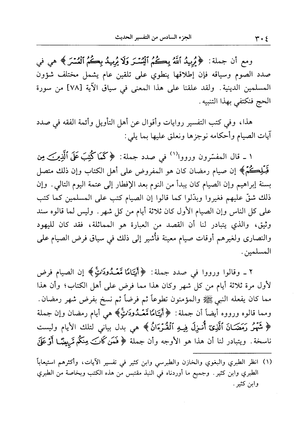 ومع أن جملة: يُرِيدُ اللَّهُ بِكُمُ الْيُسْرَ وَلا يُرِيدُ بِكُمُ الْعُسْرَ هي في صدد الصوم وسياقه فإن إطلاقها ينطوي على تلقين عام يشمل مختلف شؤون المسلمين الدينية. ولقد علقنا على هذا المعنى في سياق الآية [78] من سورة الحج فنكتفي بهذا التنبيه.
