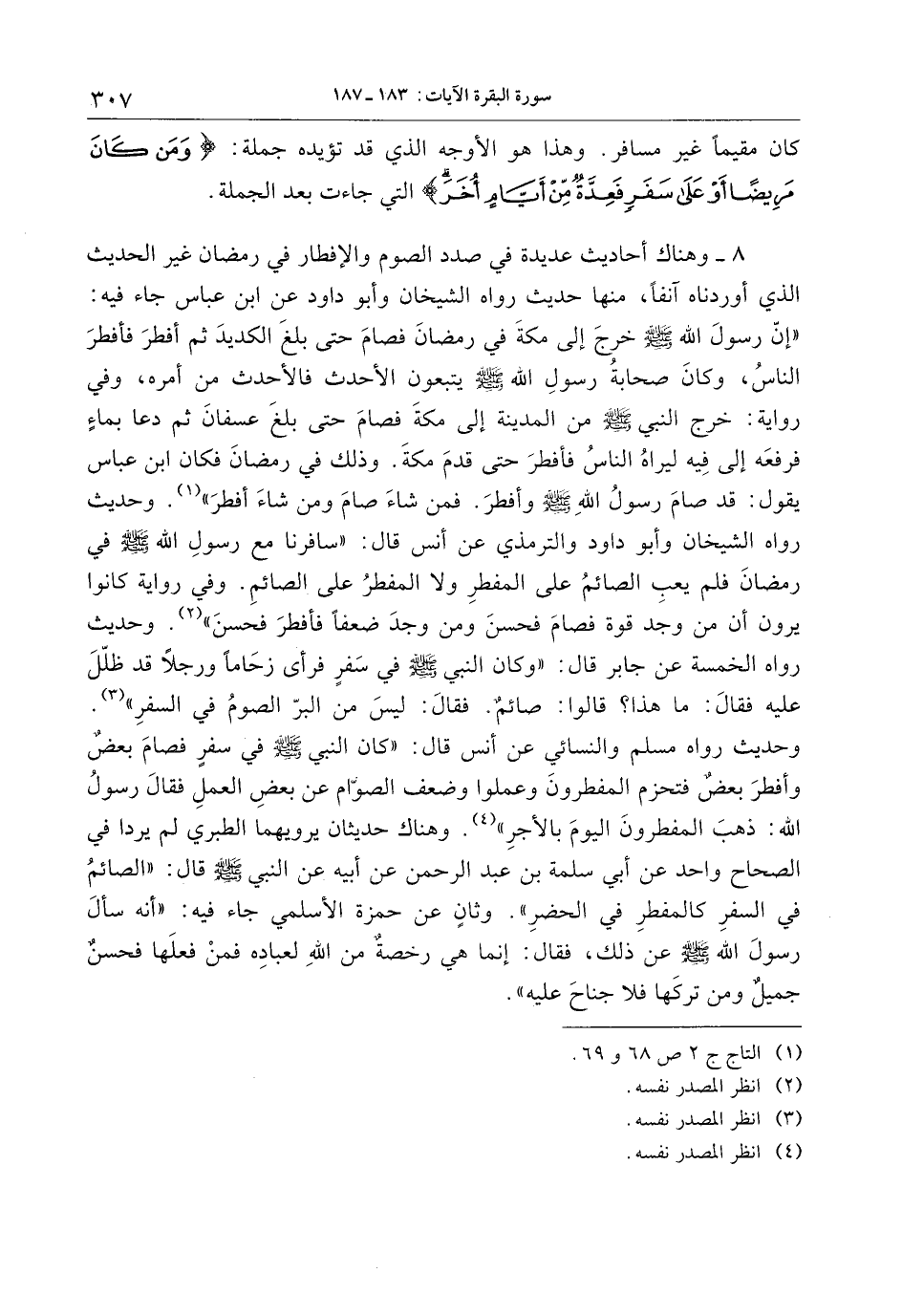 وحديث رواه مسلم والنسائي عن أنس قال: «كان النبي صلّى الله عليه وسلّم في سفر فصام بعض وأفطر بعض فتحزم المفطرون وعملوا وضعف الصوّام عن بعض العمل فقال رسول الله: ذهب المفطرون اليوم بالأجر» «4» . وهناك حديثان يرويهما الطبري لم يردا في الصحاح واحد عن أبي سلمة بن عبد الرحمن عن أبيه عن النبي صلّى الله عليه وسلّم قال: «الصائم في السفر كالمفطر في الحضر» . وثان عن حمزة الأسلمي جاء فيه: «أنه سأل رسول الله صلّى الله عليه وسلّم عن ذلك، فقال: إنما هي رخصة من الله لعباده فمن فعلها فحسن جميل ومن تركها فلا جناح عليه» .