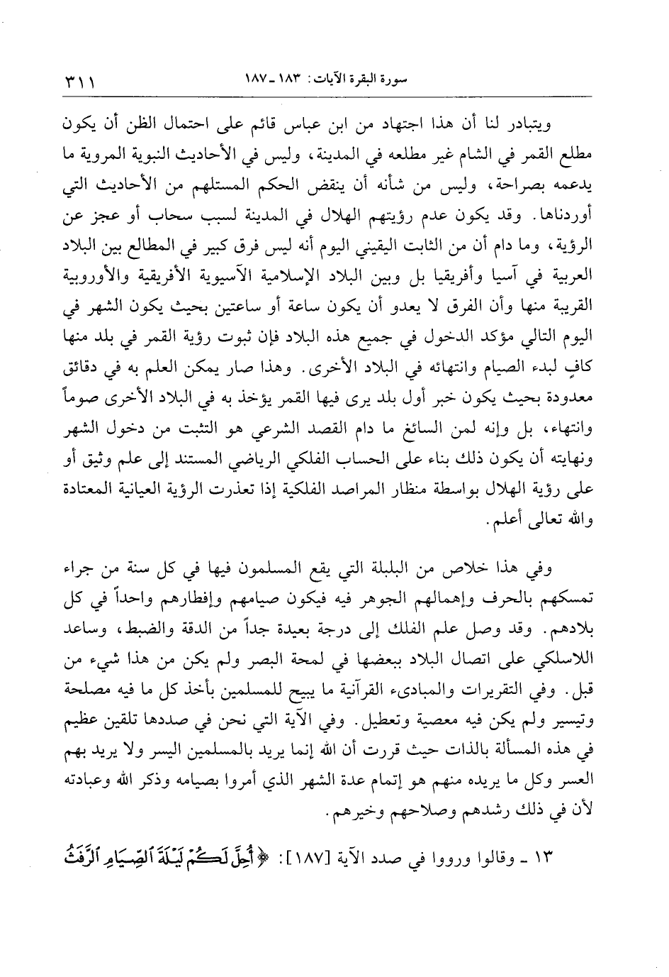 وفي هذا خلاص من البلبلة التي يقع المسلمون فيها في كل سنة من جراء تمسكهم بالحرف وإهمالهم الجوهر فيه فيكون صيامهم وإفطارهم واحدا في كل بلادهم. وقد وصل علم الفلك إلى درجة بعيدة جدا من الدقة والضبط، وساعد اللاسلكي على اتصال البلاد ببعضها في لمحة البصر ولم يكن من هذا شيء من قبل. وفي التقريرات والمبادئ القرآنية ما يبيح للمسلمين بأخذ كل ما فيه مصلحة وتيسير ولم يكن فيه معصية وتعطيل. وفي الآية التي نحن في صددها تلقين عظيم في هذه المسألة بالذات حيث قررت أن الله إنما يريد بالمسلمين اليسر ولا يريد بهم العسر وكل ما يريده منهم هو إتمام عدة الشهر الذي أمروا بصيامه وذكر الله وعبادته لأن في ذلك رشدهم وصلاحهم وخيرهم.