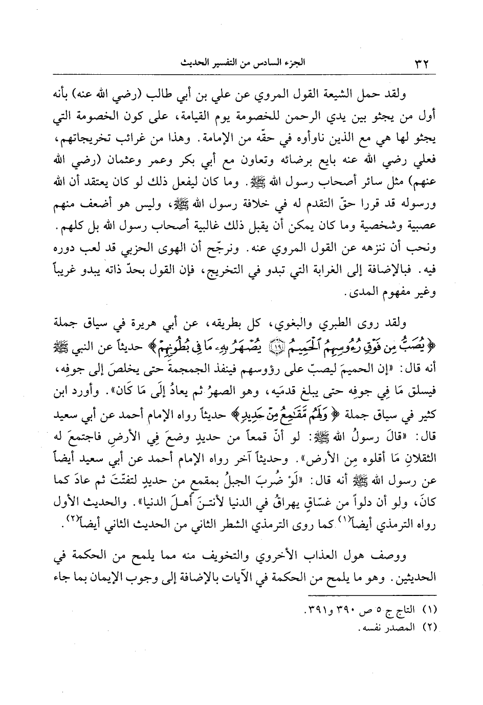 ولقد روى الطبري والبغوي، كل بطريقه، عن أبي هريرة في سياق جملة يُصَبُّ مِنْ فَوْقِ رُؤُسِهِمُ الْحَمِيمُ (19) يُصْهَرُ بِهِ ما فِي بُطُونِهِمْ حديثا عن النبي صلّى الله عليه وسلّم أنه قال: «إن الحميم ليصبّ على رؤوسهم فينفذ الجمجمة حتى يخلص إلى جوفه، فيسلق ما في جوفه حتى يبلغ قدميه، وهو الصهر ثم يعاد إلى ما كان» . وأورد ابن كثير في سياق جملة وَلَهُمْ مَقامِعُ مِنْ حَدِيدٍ حديثا رواه الإمام أحمد عن أبي سعيد قال: «قال رسول الله صلّى الله عليه وسلّم: لو أنّ قمعا من حديد وضع في الأرض فاجتمع له الثقلان ما أقلوه من الأرض» . وحديثا آخر رواه الإمام أحمد عن أبي سعيد أيضا عن رسول الله صلّى الله عليه وسلّم أنه قال: «لو ضرب الجبل بمقمع من حديد لتفتّت ثم عاد كما كان، ولو أن دلوا من غسّاق يهراق في الدنيا لأنتن أهل الدنيا» . والحديث الأول رواه الترمذي أيضا «1» كما روى الترمذي الشطر الثاني من الحديث الثاني أيضا «2» .