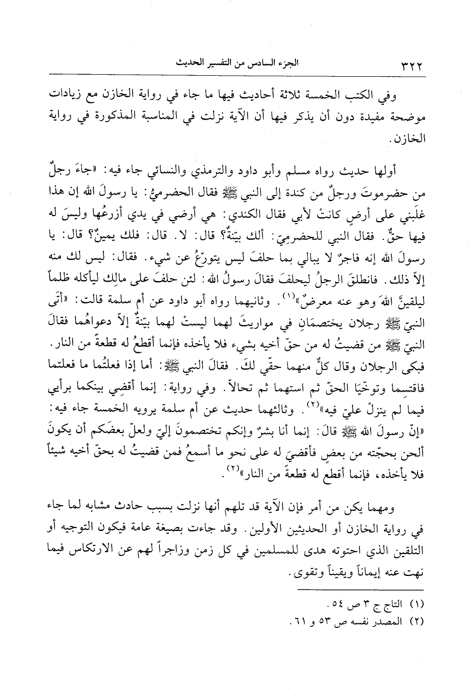 أولها حديث رواه مسلم وأبو داود والترمذي والنسائي جاء فيه: «جاء رجل من حضرموت ورجل من كندة إلى النبي صلّى الله عليه وسلّم فقال الحضرميّ: يا رسول الله إن هذا غلبني على أرض كانت لأبي فقال الكندي: هي أرضي في يدي أزرعها وليس له فيها حقّ. فقال النبي للحضرميّ: ألك بيّنة؟ قال: لا. قال: فلك يمين؟ قال: يا رسول الله إنه فاجر لا يبالي بما حلف ليس يتورّع عن شيء. فقال: ليس لك منه إلّا ذلك. فانطلق الرجل ليحلف فقال رسول الله: لئن حلف على مالك ليأكله ظلما ليلقينّ الله وهو عنه معرض» «1» . وثانيهما رواه أبو داود عن أم سلمة قالت: «أتى النبيّ صلّى الله عليه وسلّم رجلان يختصمان في مواريث لهما ليست لهما بيّنة إلّا دعواهما فقال النّبي صلّى الله عليه وسلّم من قضيت له من حقّ أخيه بشيء فلا يأخذه فإنما أقطع له قطعة من النار.