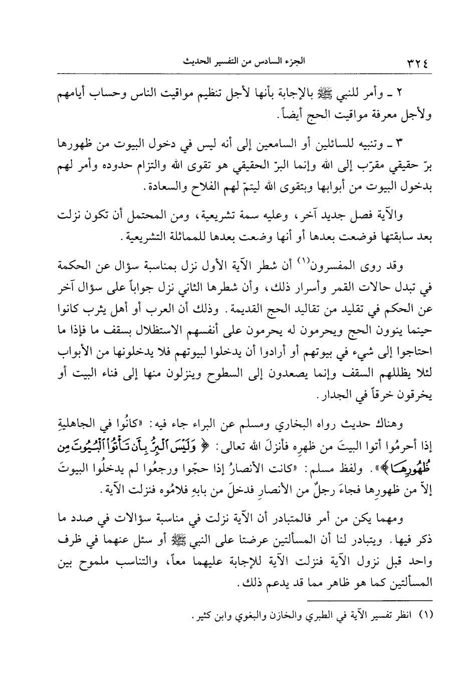 وهناك حديث رواه البخاري ومسلم عن البراء جاء فيه: «كانوا في الجاهلية إذا أحرموا أتوا البيت من ظهره فأنزل الله تعالى: وَلَيْسَ الْبِرُّ بِأَنْ تَأْتُوا الْبُيُوتَ مِنْ ظُهُورِها» . ولفظ مسلم: «كانت الأنصار إذا حجّوا ورجعوا لم يدخلوا البيوت إلّا من ظهورها فجاء رجل من الأنصار فدخل من بابه فلاموه فنزلت الآية.