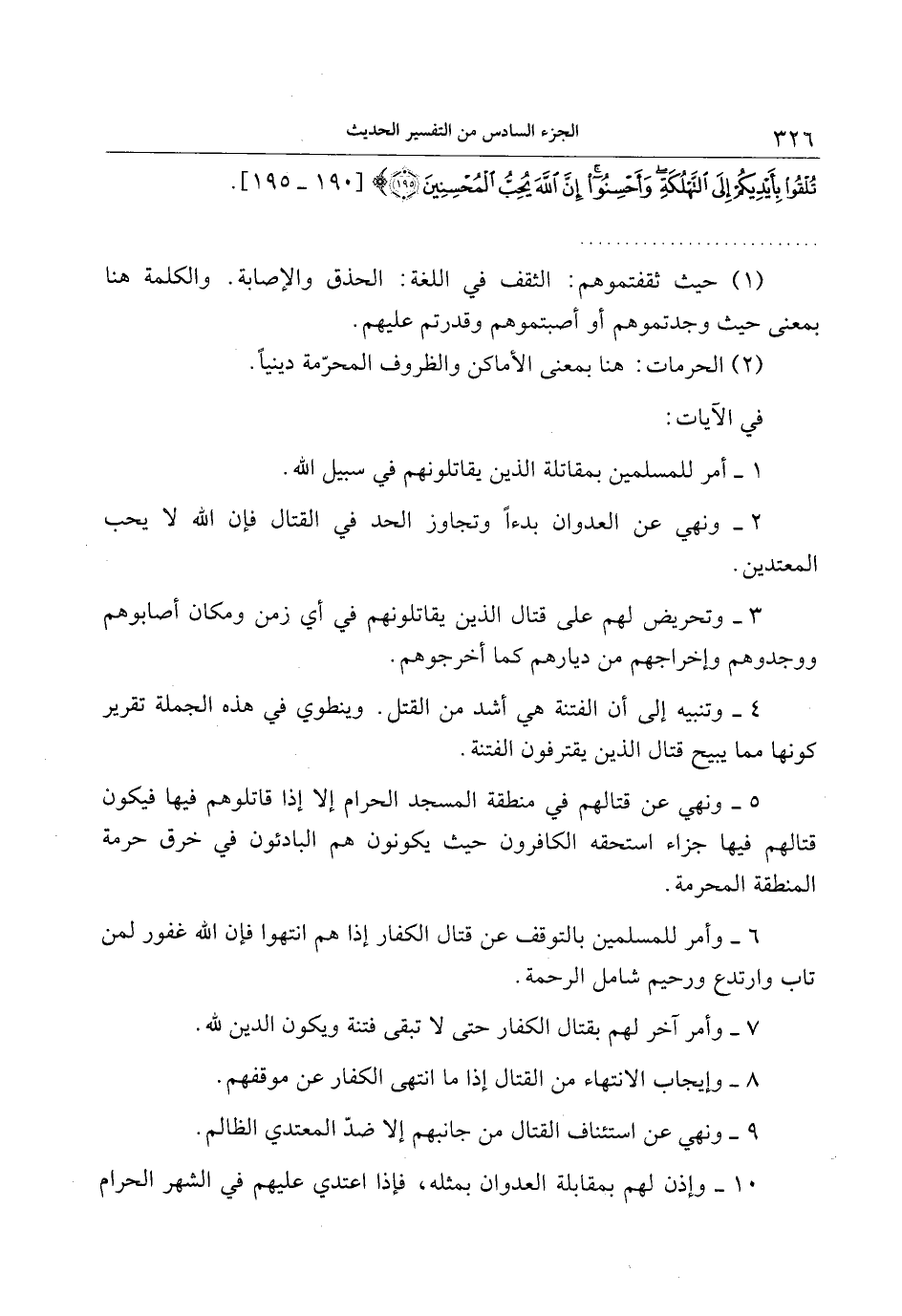 5- ونهي عن قتالهم في منطقة المسجد الحرام إلا إذا قاتلوهم فيها فيكون قتالهم فيها جزاء استحقه الكافرون حيث يكونون هم البادئون في خرق حرمة المنطقة المحرمة.