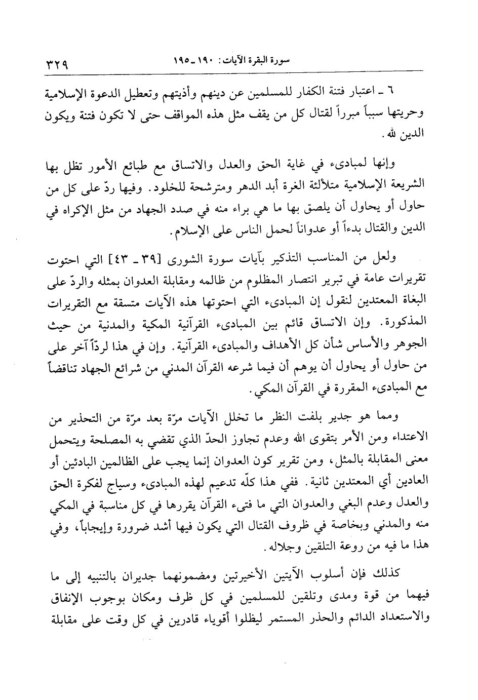 وإنها لمبادىء في غاية الحق والعدل والاتساق مع طبائع الأمور تظل بها الشريعة الإسلامية متلألئة الغرة أبد الدهر ومترشحة للخلود. وفيها ردّ على كل من حاول أو يحاول أن يلصق بها ما هي براء منه في صدد الجهاد من مثل الإكراه في الدين والقتال بدءا أو عدوانا لحمل الناس على الإسلام.