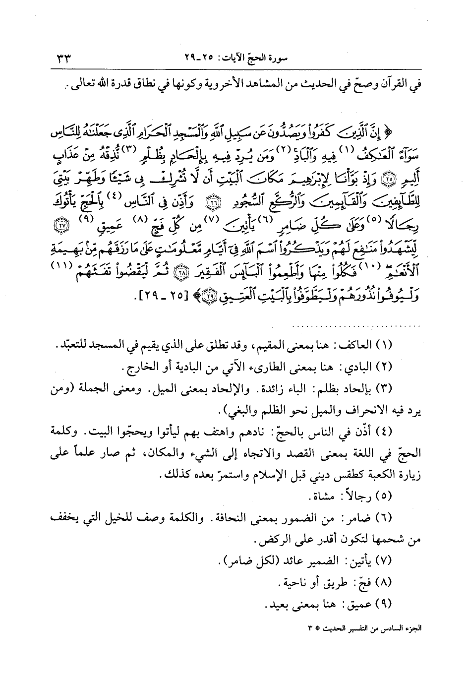 إِنَّ الَّذِينَ كَفَرُوا وَيَصُدُّونَ عَنْ سَبِيلِ اللَّهِ وَالْمَسْجِدِ الْحَرامِ الَّذِي جَعَلْناهُ لِلنَّاسِ سَواءً الْعاكِفُ فِيهِ وَالْبادِ وَمَنْ يُرِدْ فِيهِ بِإِلْحادٍ بِظُلْمٍ نُذِقْهُ مِنْ عَذابٍ أَلِيمٍ (25) وَإِذْ بَوَّأْنا لِإِبْراهِيمَ مَكانَ الْبَيْتِ أَنْ لا تُشْرِكْ بِي شَيْئاً وَطَهِّرْ بَيْتِيَ لِلطَّائِفِينَ وَالْقائِمِينَ وَالرُّكَّعِ السُّجُودِ (26) وَأَذِّنْ فِي النَّاسِ بِالْحَجِّ يَأْتُوكَ رِجالاً وَعَلى كُلِّ ضامِرٍ يَأْتِينَ مِنْ كُلِّ فَجٍّ عَمِيقٍ (27) لِيَشْهَدُوا مَنافِعَ لَهُمْ وَيَذْكُرُوا اسْمَ اللَّهِ فِي أَيَّامٍ مَعْلُوماتٍ عَلى ما رَزَقَهُمْ مِنْ بَهِيمَةِ الْأَنْعامِ فَكُلُوا مِنْها وَأَطْعِمُوا الْبائِسَ الْفَقِيرَ (28) ثُمَّ لْيَقْضُوا تَفَثَهُمْ وَلْيُوفُوا نُذُورَهُمْ وَلْيَطَّوَّفُوا بِالْبَيْتِ الْعَتِيقِ (29)