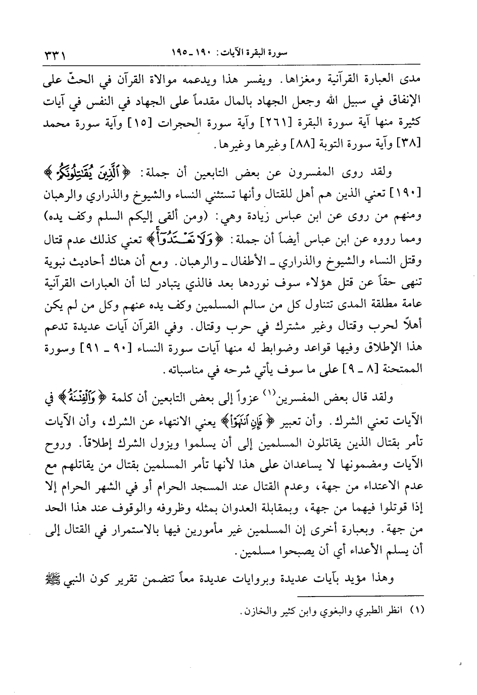 ولقد روى المفسرون عن بعض التابعين أن جملة: الَّذِينَ يُقاتِلُونَكُمْ [190] تعني الذين هم أهل للقتال وأنها تستثني النساء والشيوخ والذراري والرهبان ومنهم من روى عن ابن عباس زيادة وهي: (ومن ألقى إليكم السلم وكف يده) ومما رووه عن ابن عباس أيضا أن جملة: وَلا تَعْتَدُوا تعني كذلك عدم قتال وقتل النساء والشيوخ والذراري- الأطفال- والرهبان. ومع أن هناك أحاديث نبوية تنهى حقا عن قتل هؤلاء سوف نوردها بعد فالذي يتبادر لنا أن العبارات القرآنية عامة مطلقة المدى تتناول كل من سالم المسلمين وكف يده عنهم وكل من لم يكن أهلا لحرب وقتال وغير مشترك في حرب وقتال. وفي القرآن آيات عديدة تدعم هذا الإطلاق وفيها قواعد وضوابط له منها آيات سورة النساء [90- 91] وسورة الممتحنة [8- 9] على ما سوف يأتي شرحه في مناسباته.