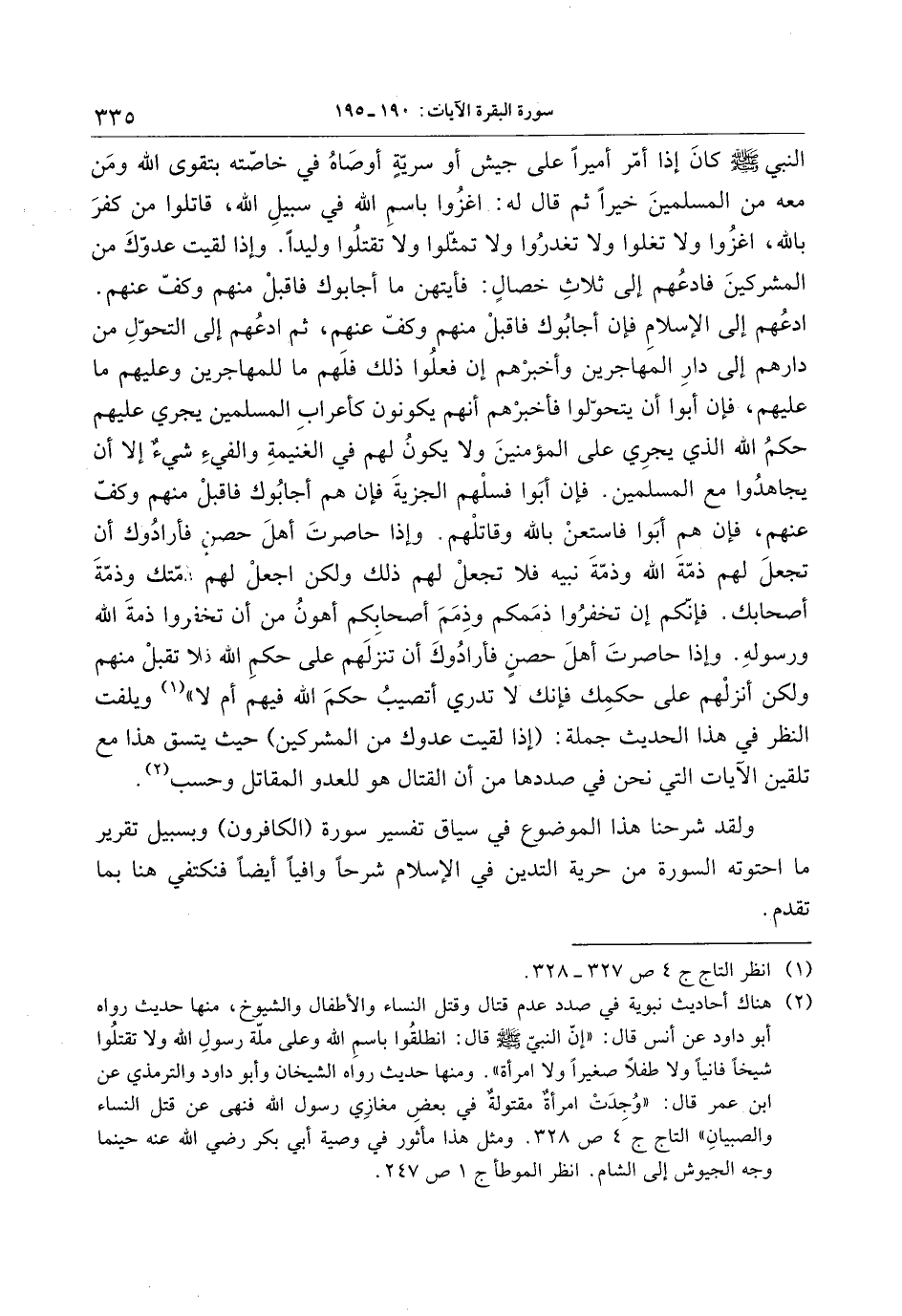 (2) هناك أحاديث نبوية في صدد عدم قتال وقتل النساء والأطفال والشيوخ، منها حديث رواه أبو داود عن أنس قال: «إنّ النبيّ صلّى الله عليه وسلّم قال: انطلقوا باسم الله وعلى ملّة رسول الله ولا تقتلوا شيخا فانيا ولا طفلا صغيرا ولا امرأة» . ومنها حديث رواه الشيخان وأبو داود والترمذي عن ابن عمر قال: «وجدت امرأة مقتولة في بعض مغازي رسول الله فنهى عن قتل النساء والصبيان» التاج ج 4 ص 328. ومثل هذا مأثور في وصية أبي بكر رضي الله عنه حينما وجه الجيوش إلى الشام. انظر الموطأ ج 1 ص 247.