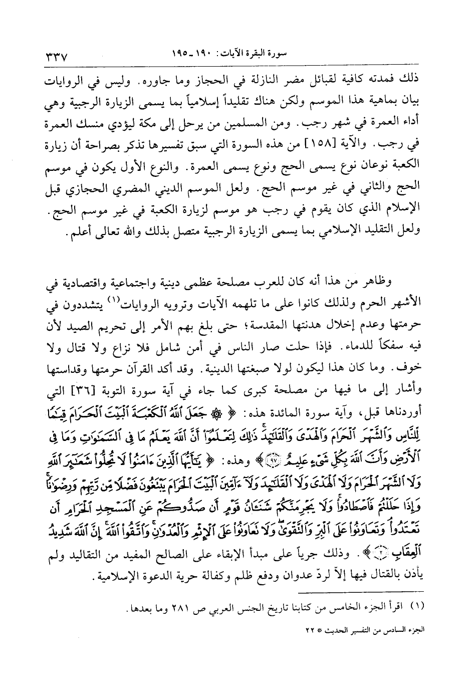 ذلك فمدته كافية لقبائل مضر النازلة في الحجاز وما جاوره. وليس في الروايات بيان بماهية هذا الموسم ولكن هناك تقليدا إسلاميا بما يسمى الزيارة الرجبية وهي أداء العمرة في شهر رجب. ومن المسلمين من يرحل إلى مكة ليؤدي منسك العمرة في رجب. والآية [158] من هذه السورة التي سبق تفسيرها تذكر بصراحة أن زيارة الكعبة نوعان نوع يسمى الحج ونوع يسمى العمرة. والنوع الأول يكون في موسم الحج والثاني في غير موسم الحج. ولعل الموسم الديني المضري الحجازي قبل الإسلام الذي كان يقوم في رجب هو موسم لزيارة الكعبة في غير موسم الحج.