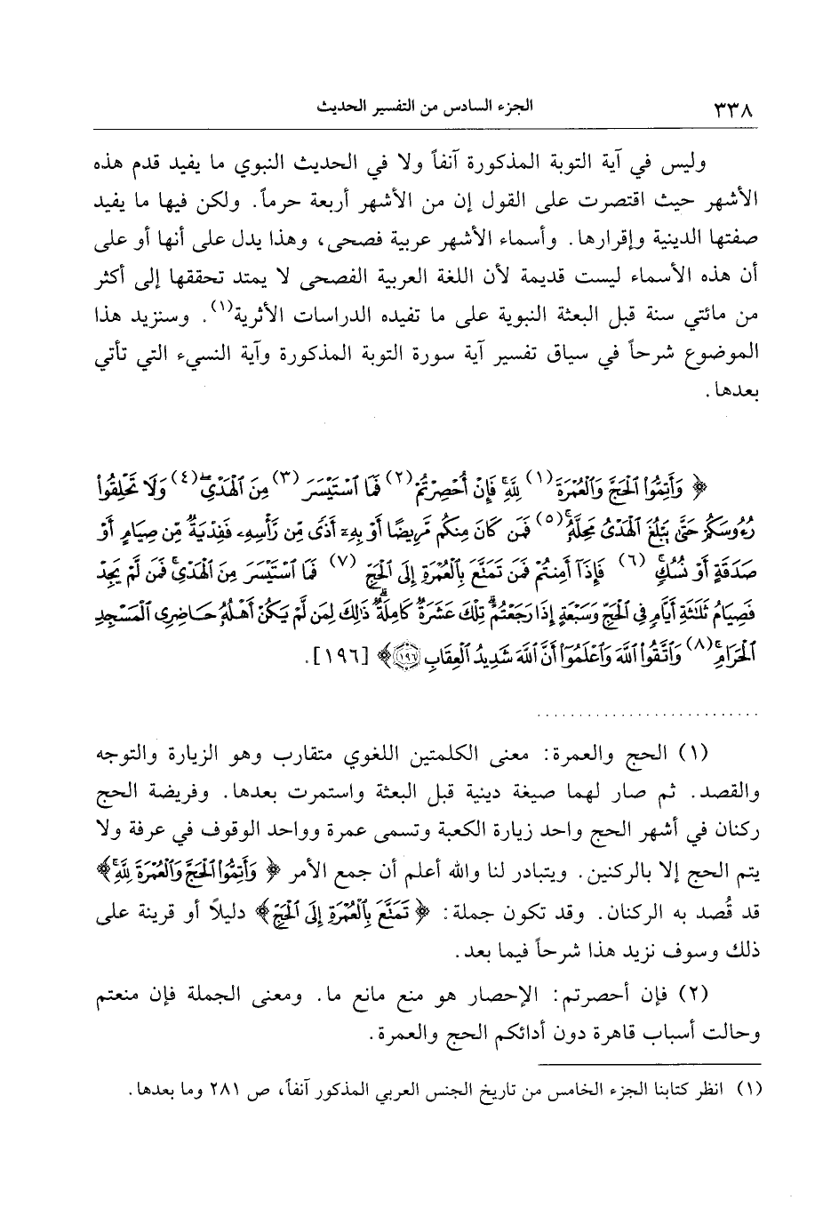 . (1) الحج والعمرة: معنى الكلمتين اللغوي متقارب وهو الزيارة والتوجه والقصد. ثم صار لهما صيغة دينية قبل البعثة واستمرت بعدها. وفريضة الحج ركنان في أشهر الحج واحد زيارة الكعبة وتسمى عمرة وواحد الوقوف في عرفة ولا يتم الحج إلا بالركنين. ويتبادر لنا والله أعلم أن جمع الأمر وَأَتِمُّوا الْحَجَّ وَالْعُمْرَةَ لِلَّهِ قد قصد به الركنان. وقد تكون جملة: تَمَتَّعَ بِالْعُمْرَةِ إِلَى الْحَجِّ دليلا أو قرينة على ذلك وسوف نزيد هذا شرحا فيما بعد.