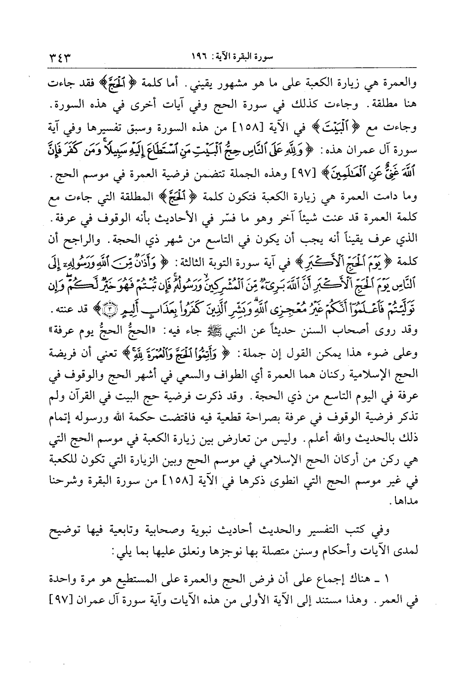 وقد روى أصحاب السنن حديثا عن النبي صلّى الله عليه وسلّم جاء فيه: «الحجّ الحجّ يوم عرفة» وعلى ضوء هذا يمكن القول إن جملة: وَأَتِمُّوا الْحَجَّ وَالْعُمْرَةَ لِلَّهِ تعني أن فريضة الحج الإسلامية ركنان هما العمرة أي الطواف والسعي في أشهر الحج والوقوف في عرفة في اليوم التاسع من ذي الحجة. وقد ذكرت فرضية حج البيت في القرآن ولم تذكر فرضية الوقوف في عرفة بصراحة قطعية فيه فاقتضت حكمة الله ورسوله إتمام ذلك بالحديث والله أعلم. وليس من تعارض بين زيارة الكعبة في موسم الحج التي هي ركن من أركان الحج الإسلامي في موسم الحج وبين الزيارة التي تكون للكعبة في غير موسم الحج التي انطوى ذكرها في الآية [158] من سورة البقرة وشرحنا مداها.