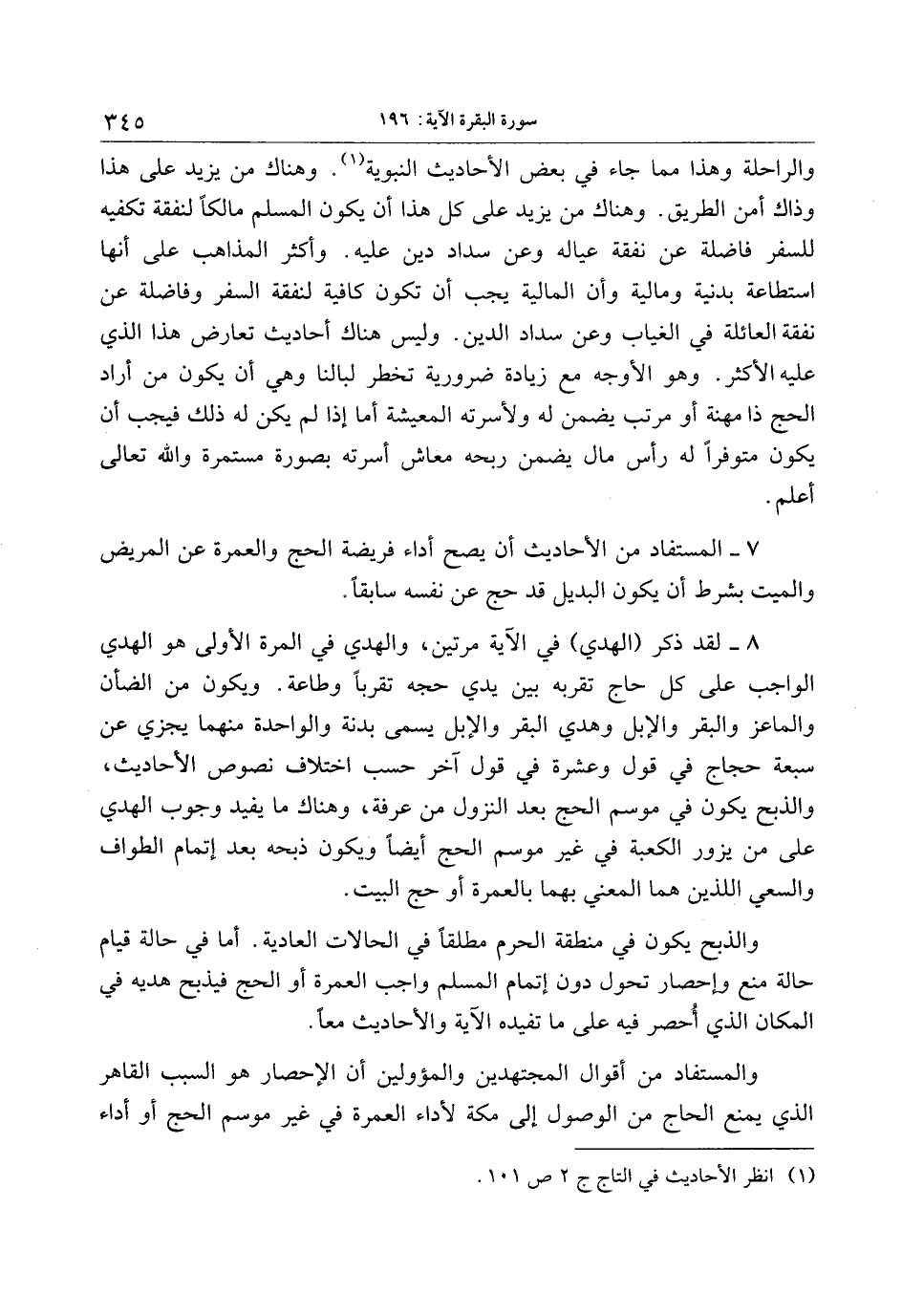 8- لقد ذكر (الهدي) في الآية مرتين، والهدي في المرة الأولى هو الهدي الواجب على كل حاج تقربه بين يدي حجه تقربا وطاعة. ويكون من الضأن والماعز والبقر والإبل وهدي البقر والإبل يسمى بدنة والواحدة منهما يجزي عن سبعة حجاج في قول وعشرة في قول آخر حسب اختلاف نصوص الأحاديث، والذبح يكون في موسم الحج بعد النزول من عرفة، وهناك ما يفيد وجوب الهدي على من يزور الكعبة في غير موسم الحج أيضا ويكون ذبحه بعد إتمام الطواف والسعي اللذين هما المعني بهما بالعمرة أو حج البيت.