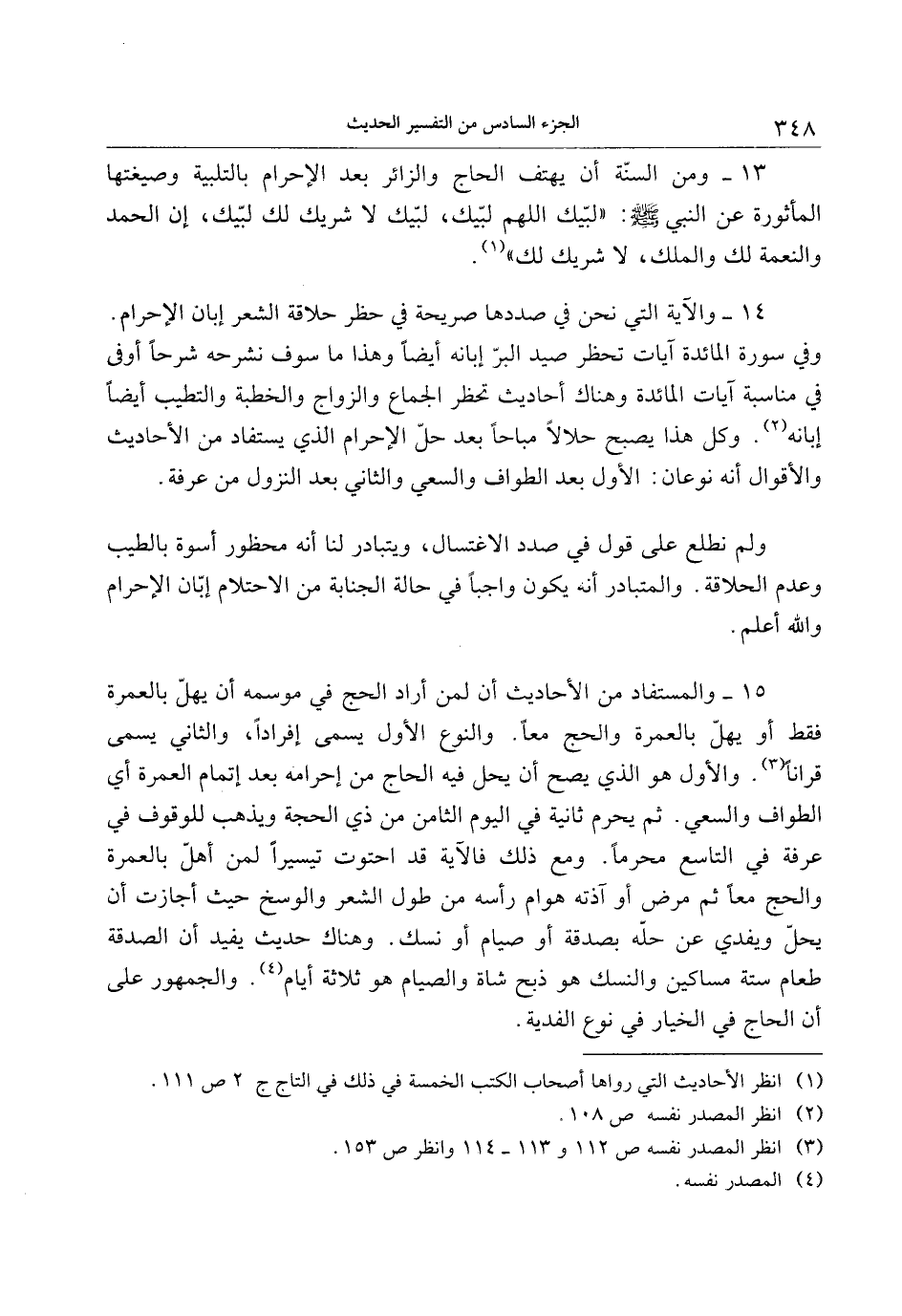 وفي سورة المائدة آيات تحظر صيد البرّ إبانه أيضا وهذا ما سوف نشرحه شرحا أوفى في مناسبة آيات المائدة وهناك أحاديث تحظر الجماع والزواج والخطبة والتطيب أيضا إبانه «2» . وكل هذا يصبح حلالا مباحا بعد حلّ الإحرام الذي يستفاد من الأحاديث والأقوال أنه نوعان: الأول بعد الطواف والسعي والثاني بعد النزول من عرفة.