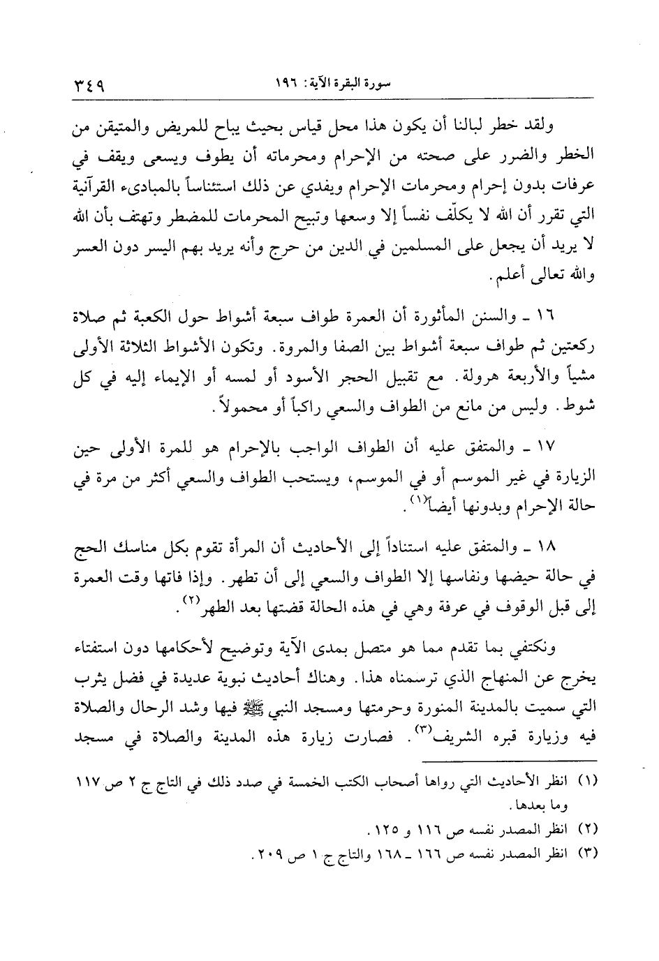 ونكتفي بما تقدم مما هو متصل بمدى الآية وتوضيح لأحكامها دون استفتاء يخرج عن المنهاج الذي ترسمناه هذا. وهناك أحاديث نبوية عديدة في فضل يثرب التي سميت بالمدينة المنورة وحرمتها ومسجد النبي صلّى الله عليه وسلّم فيها وشد الرحال والصلاة فيه وزيارة قبره الشريف «3» . فصارت زيارة هذه المدينة والصلاة في مسجد