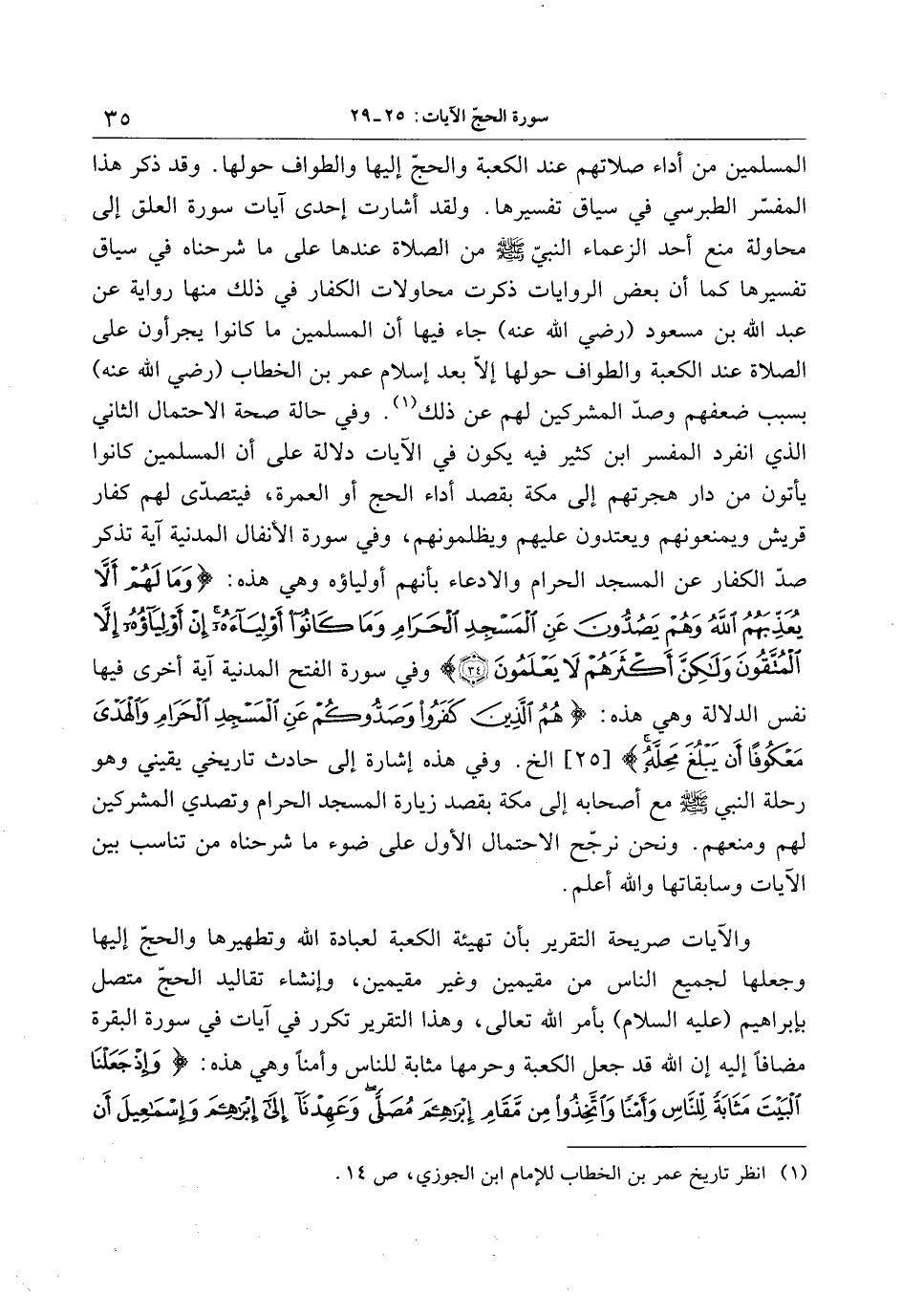 المسلمين من أداء صلاتهم عند الكعبة والحجّ إليها والطواف حولها. وقد ذكر هذا المفسّر الطبرسي في سياق تفسيرها. ولقد أشارت إحدى آيات سورة العلق إلى محاولة منع أحد الزعماء النبيّ صلّى الله عليه وسلّم من الصلاة عندها على ما شرحناه في سياق تفسيرها كما أن بعض الروايات ذكرت محاولات الكفار في ذلك منها رواية عن عبد الله بن مسعود (رضي الله عنه) جاء فيها أن المسلمين ما كانوا يجرأون على الصلاة عند الكعبة والطواف حولها إلّا بعد إسلام عمر بن الخطاب (رضي الله عنه) بسبب ضعفهم وصدّ المشركين لهم عن ذلك «1» . وفي حالة صحة الاحتمال الثاني الذي انفرد المفسر ابن كثير فيه يكون في الآيات دلالة على أن المسلمين كانوا يأتون من دار هجرتهم إلى مكة بقصد أداء الحج أو العمرة، فيتصدّى لهم كفار قريش ويمنعونهم ويعتدون عليهم ويظلمونهم، وفي سورة الأنفال المدنية آية تذكر صدّ الكفار عن المسجد الحرام والادعاء بأنهم أولياؤه وهي هذه: وَما لَهُمْ أَلَّا يُعَذِّبَهُمُ اللَّهُ وَهُمْ يَصُدُّونَ عَنِ الْمَسْجِدِ الْحَرامِ وَما كانُوا أَوْلِياءَهُ إِنْ أَوْلِياؤُهُ إِلَّا الْمُتَّقُونَ وَلكِنَّ أَكْثَرَهُمْ لا يَعْلَمُونَ (34) وفي سورة الفتح المدنية آية أخرى فيها نفس الدلالة وهي هذه: هُمُ الَّذِينَ كَفَرُوا وَصَدُّوكُمْ عَنِ الْمَسْجِدِ الْحَرامِ وَالْهَدْيَ مَعْكُوفاً أَنْ يَبْلُغَ مَحِلَّهُ [25] إلخ. وفي هذه إشارة إلى حادث تاريخي يقيني وهو رحلة النبي صلّى الله عليه وسلّم مع أصحابه إلى مكة بقصد زيارة المسجد الحرام وتصدي المشركين لهم ومنعهم. ونحن نرجّح الاحتمال الأول على ضوء ما شرحناه من تناسب بين الآيات وسابقاتها والله أعلم.