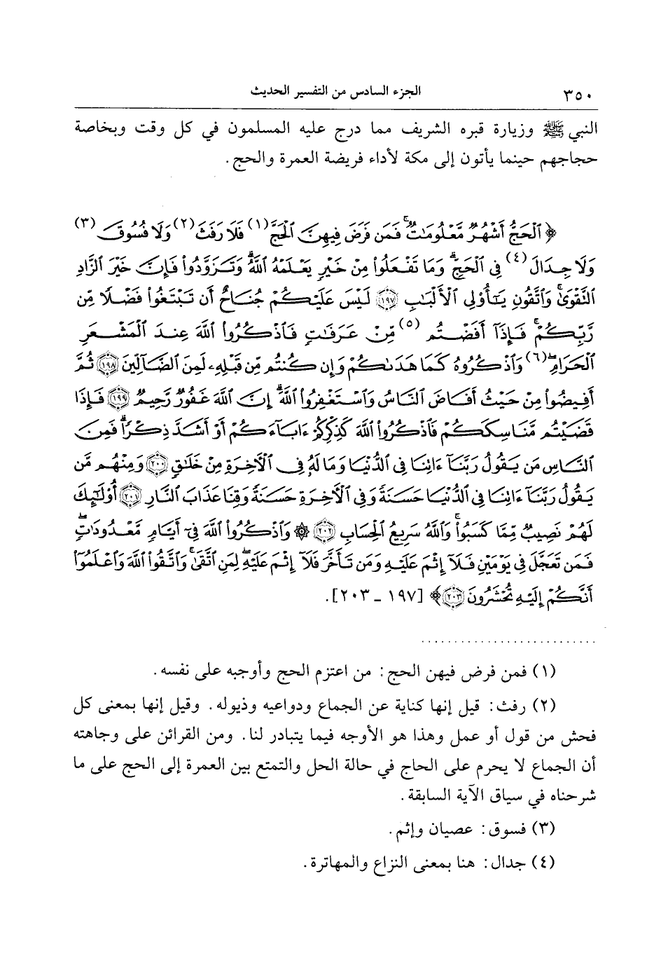 (2) رفث: قيل إنها كناية عن الجماع ودواعيه وذيوله. وقيل إنها بمعنى كل فحش من قول أو عمل وهذا هو الأوجه فيما يتبادر لنا. ومن القرائن على وجاهته أن الجماع لا يحرم على الحاج في حالة الحل والتمتع بين العمرة إلى الحج على ما شرحناه في سياق الآية السابقة.