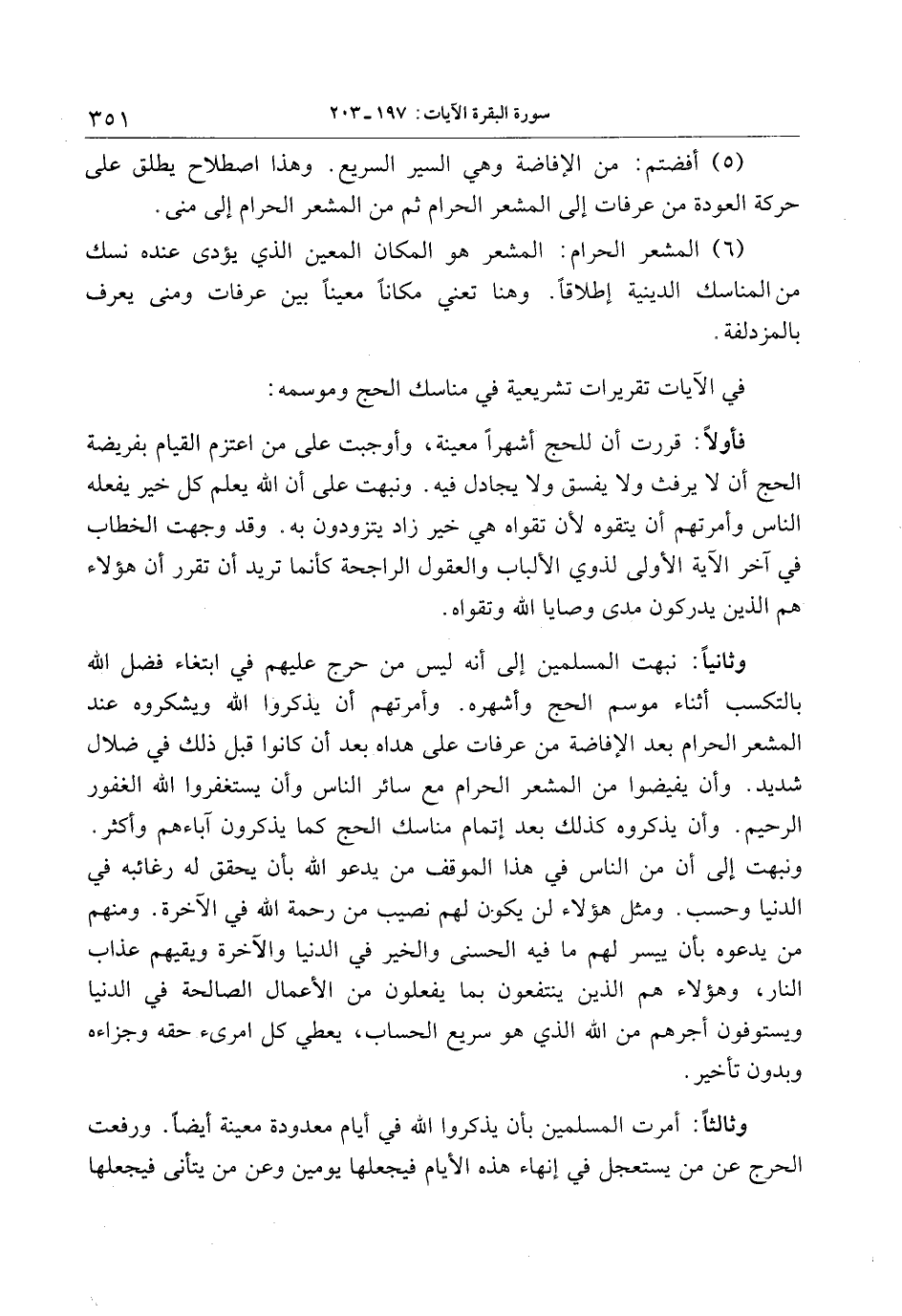 وثانيا: نبهت المسلمين إلى أنه ليس من حرج عليهم في ابتغاء فضل الله بالتكسب أثناء موسم الحج وأشهره. وأمرتهم أن يذكروا الله ويشكروه عند المشعر الحرام بعد الإفاضة من عرفات على هداه بعد أن كانوا قبل ذلك في ضلال شديد. وأن يفيضوا من المشعر الحرام مع سائر الناس وأن يستغفروا الله الغفور الرحيم. وأن يذكروه كذلك بعد إتمام مناسك الحج كما يذكرون آباءهم وأكثر.