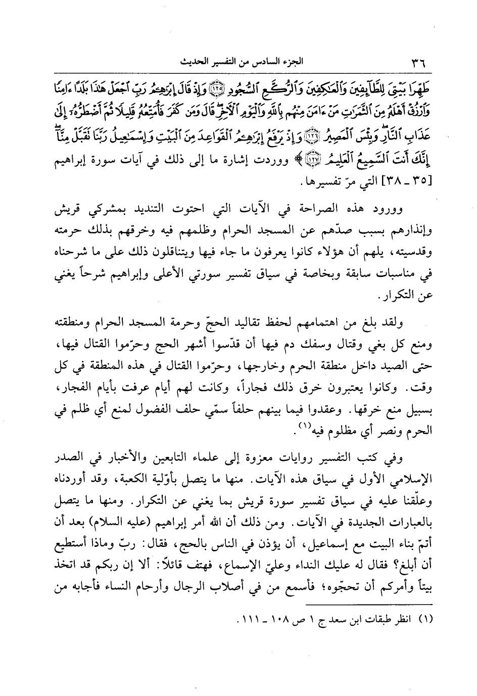 طَهِّرا بَيْتِيَ لِلطَّائِفِينَ وَالْعاكِفِينَ وَالرُّكَّعِ السُّجُودِ (125) وَإِذْ قالَ إِبْراهِيمُ رَبِّ اجْعَلْ هذا بَلَداً آمِناً وَارْزُقْ أَهْلَهُ مِنَ الثَّمَراتِ مَنْ آمَنَ مِنْهُمْ بِاللَّهِ وَالْيَوْمِ الْآخِرِ قالَ وَمَنْ كَفَرَ فَأُمَتِّعُهُ قَلِيلًا ثُمَّ أَضْطَرُّهُ إِلى عَذابِ النَّارِ وَبِئْسَ الْمَصِيرُ (126) وَإِذْ يَرْفَعُ إِبْراهِيمُ الْقَواعِدَ مِنَ الْبَيْتِ وَإِسْماعِيلُ رَبَّنا تَقَبَّلْ مِنَّا إِنَّكَ أَنْتَ السَّمِيعُ الْعَلِيمُ (127) ووردت إشارة ما إلى ذلك في آيات سورة إبراهيم [35- 38] التي مرّ تفسيرها.