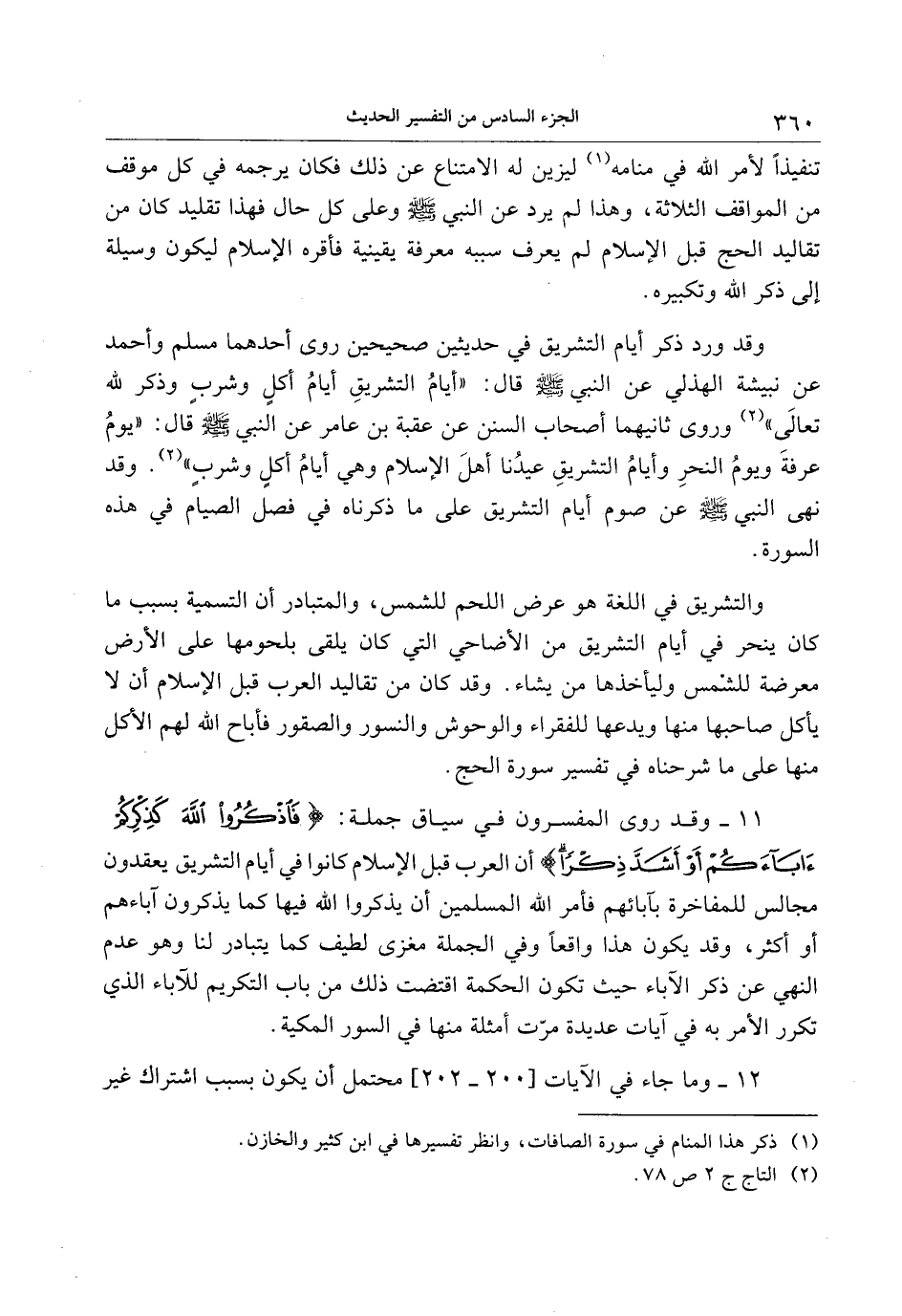 11- وقد روى المفسرون في سياق جملة: فَاذْكُرُوا اللَّهَ كَذِكْرِكُمْ آباءَكُمْ أَوْ أَشَدَّ ذِكْراً أن العرب قبل الإسلام كانوا في أيام التشريق يعقدون مجالس للمفاخرة بآبائهم فأمر الله المسلمين أن يذكروا الله فيها كما يذكرون آباءهم أو أكثر، وقد يكون هذا واقعا وفي الجملة مغزى لطيف كما يتبادر لنا وهو عدم النهي عن ذكر الآباء حيث تكون الحكمة اقتضت ذلك من باب التكريم للآباء الذي تكرر الأمر به في آيات عديدة مرّت أمثلة منها في السور المكية.