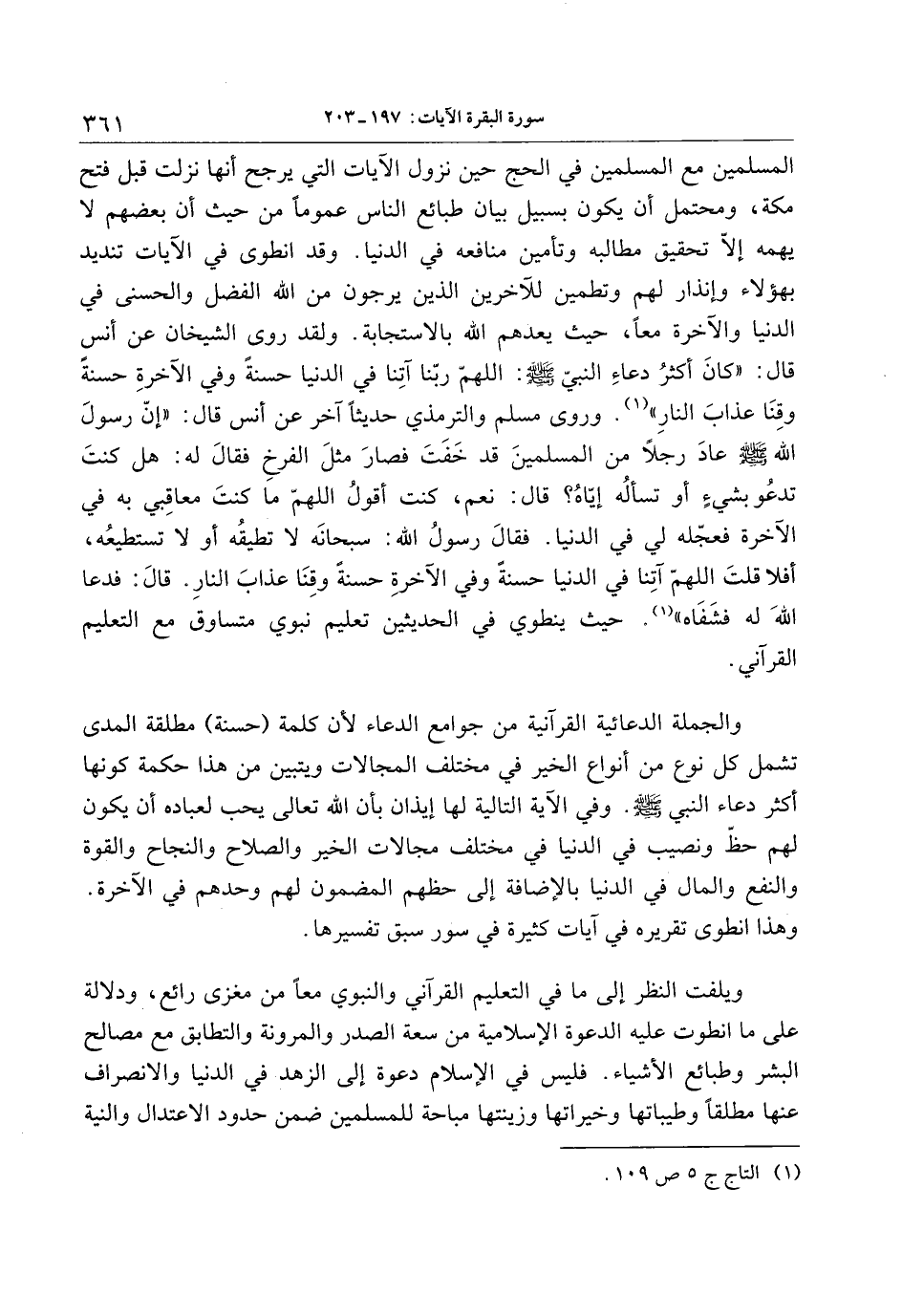 المسلمين مع المسلمين في الحج حين نزول الآيات التي يرجح أنها نزلت قبل فتح مكة، ومحتمل أن يكون بسبيل بيان طبائع الناس عموما من حيث أن بعضهم لا يهمه إلّا تحقيق مطالبه وتأمين منافعه في الدنيا. وقد انطوى في الآيات تنديد بهؤلاء وإنذار لهم وتطمين للآخرين الذين يرجون من الله الفضل والحسنى في الدنيا والآخرة معا، حيث يعدهم الله بالاستجابة. ولقد روى الشيخان عن أنس قال: «كان أكثر دعاء النبيّ صلّى الله عليه وسلّم: اللهمّ ربّنا آتنا في الدنيا حسنة وفي الآخرة حسنة وقنا عذاب النار» «1» . وروى مسلم والترمذي حديثا آخر عن أنس قال: «إنّ رسول الله صلّى الله عليه وسلّم عاد رجلا من المسلمين قد خفت فصار مثل الفرخ فقال له: هل كنت تدعو بشيء أو تسأله إيّاه؟ قال: نعم، كنت أقول اللهمّ ما كنت معاقبي به في الآخرة فعجّله لي في الدنيا. فقال رسول الله: سبحانه لا تطيقه أو لا تستطيعه، أفلا قلت اللهمّ آتنا في الدنيا حسنة وفي الآخرة حسنة وقنا عذاب النار. قال: فدعا الله له فشفاه» «2» . حيث ينطوي في الحديثين تعليم نبوي متساوق مع التعليم القرآني.