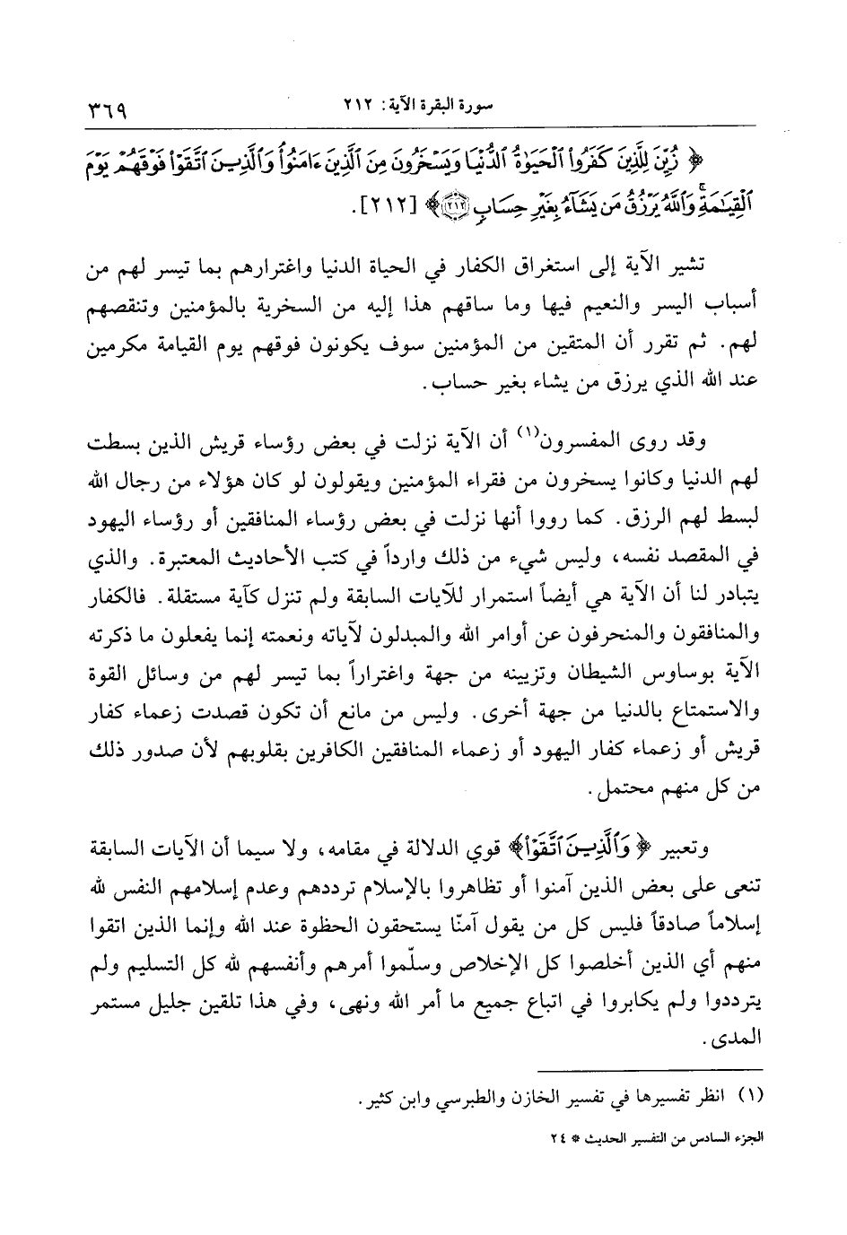وقد روى المفسرون «1» أن الآية نزلت في بعض رؤساء قريش الذين بسطت لهم الدنيا وكانوا يسخرون من فقراء المؤمنين ويقولون لو كان هؤلاء من رجال الله لبسط لهم الرزق. كما رووا أنها نزلت في بعض رؤساء المنافقين أو رؤساء اليهود في المقصد نفسه، وليس شيء من ذلك واردا في كتب الأحاديث المعتبرة. والذي يتبادر لنا أن الآية هي أيضا استمرار للآيات السابقة ولم تنزل كآية مستقلة. فالكفار والمنافقون والمنحرفون عن أوامر الله والمبدلون لآياته ونعمته إنما يفعلون ما ذكرته الآية بوساوس الشيطان وتزيينه من جهة واغترارا بما تيسر لهم من وسائل القوة والاستمتاع بالدنيا من جهة أخرى. وليس من مانع أن تكون قصدت زعماء كفار قريش أو زعماء كفار اليهود أو زعماء المنافقين الكافرين بقلوبهم لأن صدور ذلك من كل منهم محتمل.