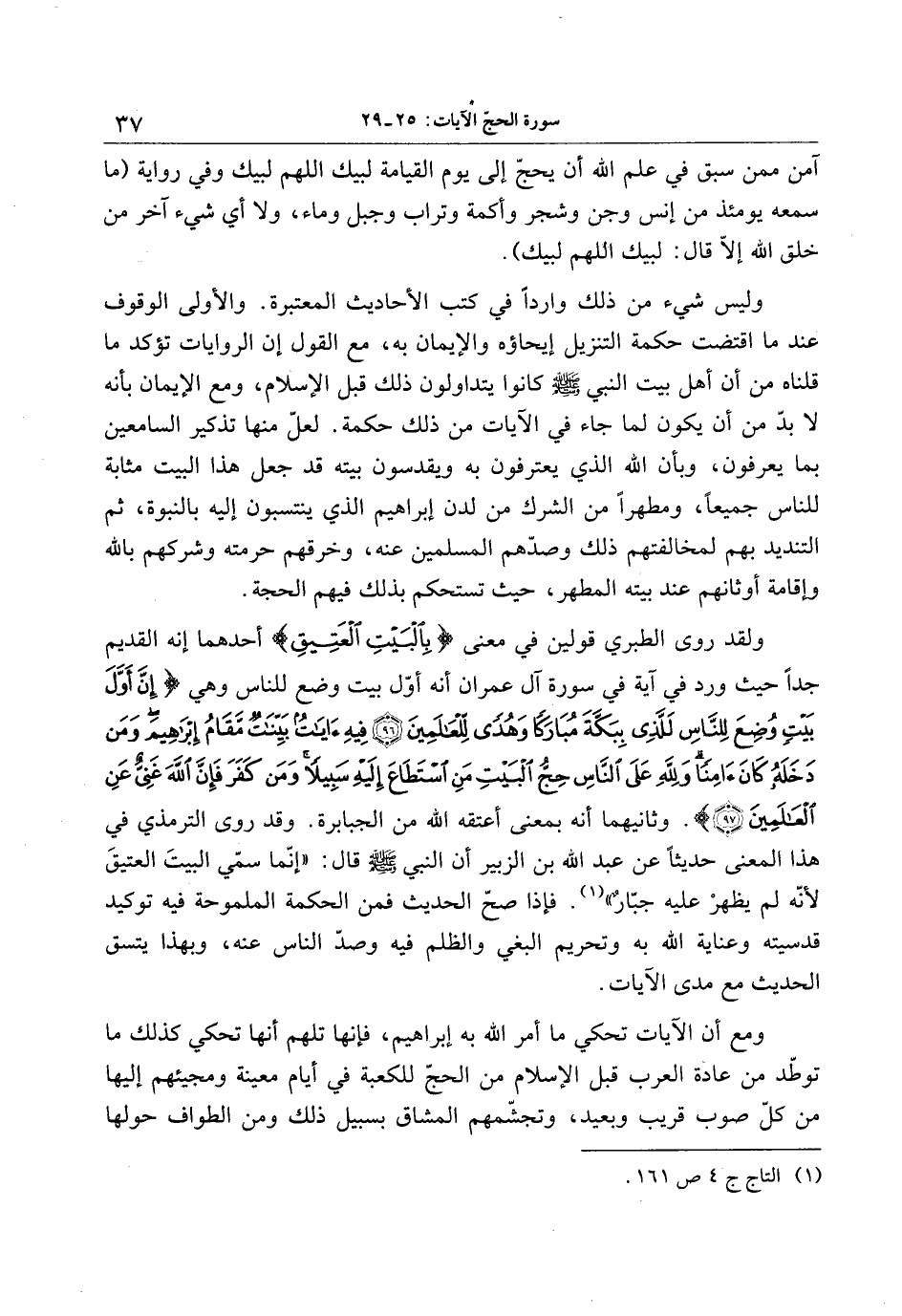 ولقد روى الطبري قولين في معنى بِالْبَيْتِ الْعَتِيقِ أحدهما إنه القديم جدا حيث ورد في آية في سورة آل عمران أنه أوّل بيت وضع للناس وهي إِنَّ أَوَّلَ بَيْتٍ وُضِعَ لِلنَّاسِ لَلَّذِي بِبَكَّةَ مُبارَكاً وَهُدىً لِلْعالَمِينَ (96) فِيهِ آياتٌ بَيِّناتٌ مَقامُ إِبْراهِيمَ وَمَنْ دَخَلَهُ كانَ آمِناً وَلِلَّهِ عَلَى النَّاسِ حِجُّ الْبَيْتِ مَنِ اسْتَطاعَ إِلَيْهِ سَبِيلًا وَمَنْ كَفَرَ فَإِنَّ اللَّهَ غَنِيٌّ عَنِ الْعالَمِينَ (97) . وثانيهما أنه بمعنى أعتقه الله من الجبابرة. وقد روى الترمذي في هذا المعنى حديثا عن عبد الله بن الزبير أن النبي صلّى الله عليه وسلّم قال: «إنّما سمّي البيت العتيق لأنّه لم يظهر عليه جبّار» «1» . فإذا صحّ الحديث فمن الحكمة الملموحة فيه توكيد قدسيته وعناية الله به وتحريم البغي والظلم فيه وصدّ الناس عنه، وبهذا يتسق الحديث مع مدى الآيات.