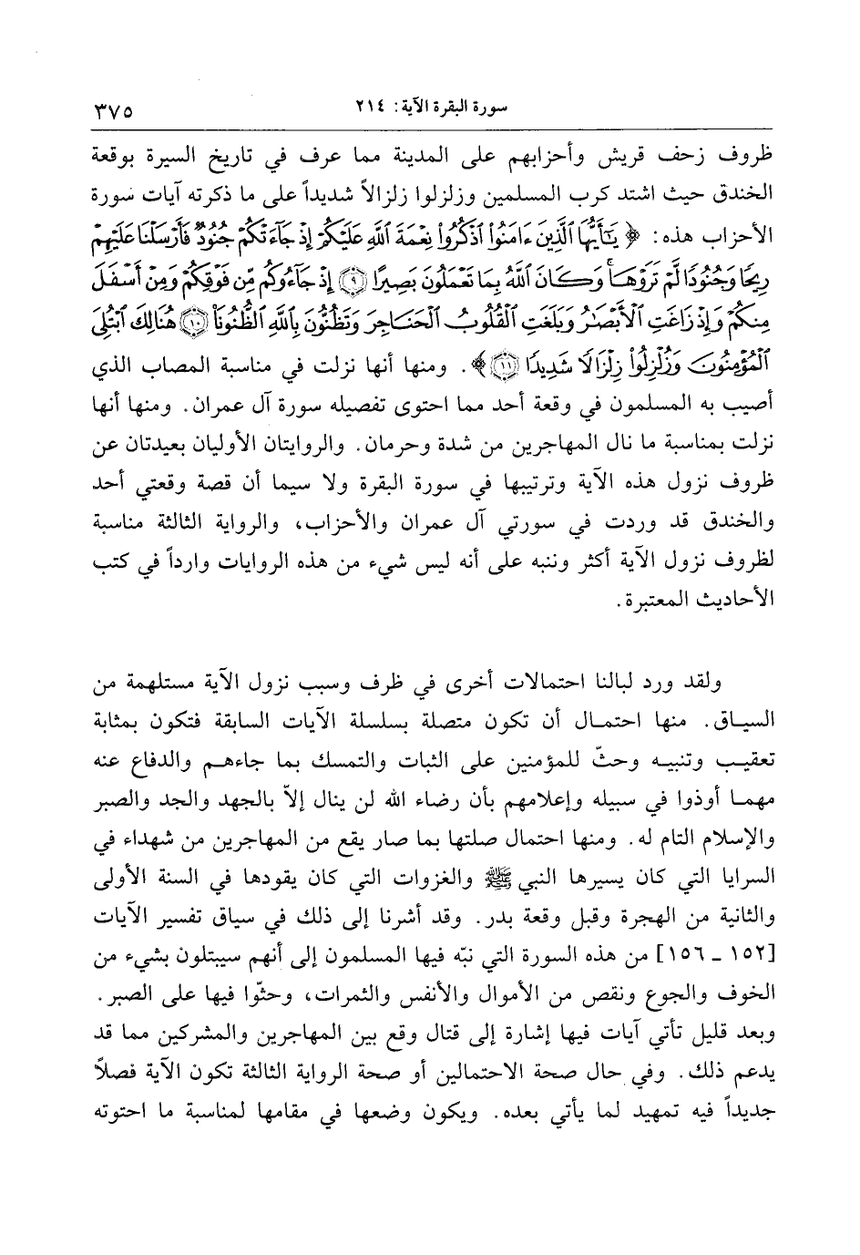 ظروف زحف قريش وأحزابهم على المدينة مما عرف في تاريخ السيرة بوقعة الخندق حيث اشتد كرب المسلمين وزلزلوا زلزالا شديدا على ما ذكرته آيات سورة الأحزاب هذه: يا أَيُّهَا الَّذِينَ آمَنُوا اذْكُرُوا نِعْمَةَ اللَّهِ عَلَيْكُمْ إِذْ جاءَتْكُمْ جُنُودٌ فَأَرْسَلْنا عَلَيْهِمْ رِيحاً وَجُنُوداً لَمْ تَرَوْها وَكانَ اللَّهُ بِما تَعْمَلُونَ بَصِيراً (9) إِذْ جاؤُكُمْ مِنْ فَوْقِكُمْ وَمِنْ أَسْفَلَ مِنْكُمْ وَإِذْ زاغَتِ الْأَبْصارُ وَبَلَغَتِ الْقُلُوبُ الْحَناجِرَ وَتَظُنُّونَ بِاللَّهِ الظُّنُونَا (10) هُنالِكَ ابْتُلِيَ الْمُؤْمِنُونَ وَزُلْزِلُوا زِلْزالًا شَدِيداً (11) . ومنها أنها نزلت في مناسبة المصاب الذي أصيب به المسلمون في وقعة أحد مما احتوى تفصيله سورة آل عمران. ومنها أنها نزلت بمناسبة ما نال المهاجرين من شدة وحرمان. والروايتان الأوليان بعيدتان عن ظروف نزول هذه الآية وترتيبها في سورة البقرة ولا سيما أن قصة وقعتي أحد والخندق قد وردت في سورتي آل عمران والأحزاب، والرواية الثالثة مناسبة لظروف نزول الآية أكثر وننبه على أنه ليس شيء من هذه الروايات واردا في كتب الأحاديث المعتبرة.