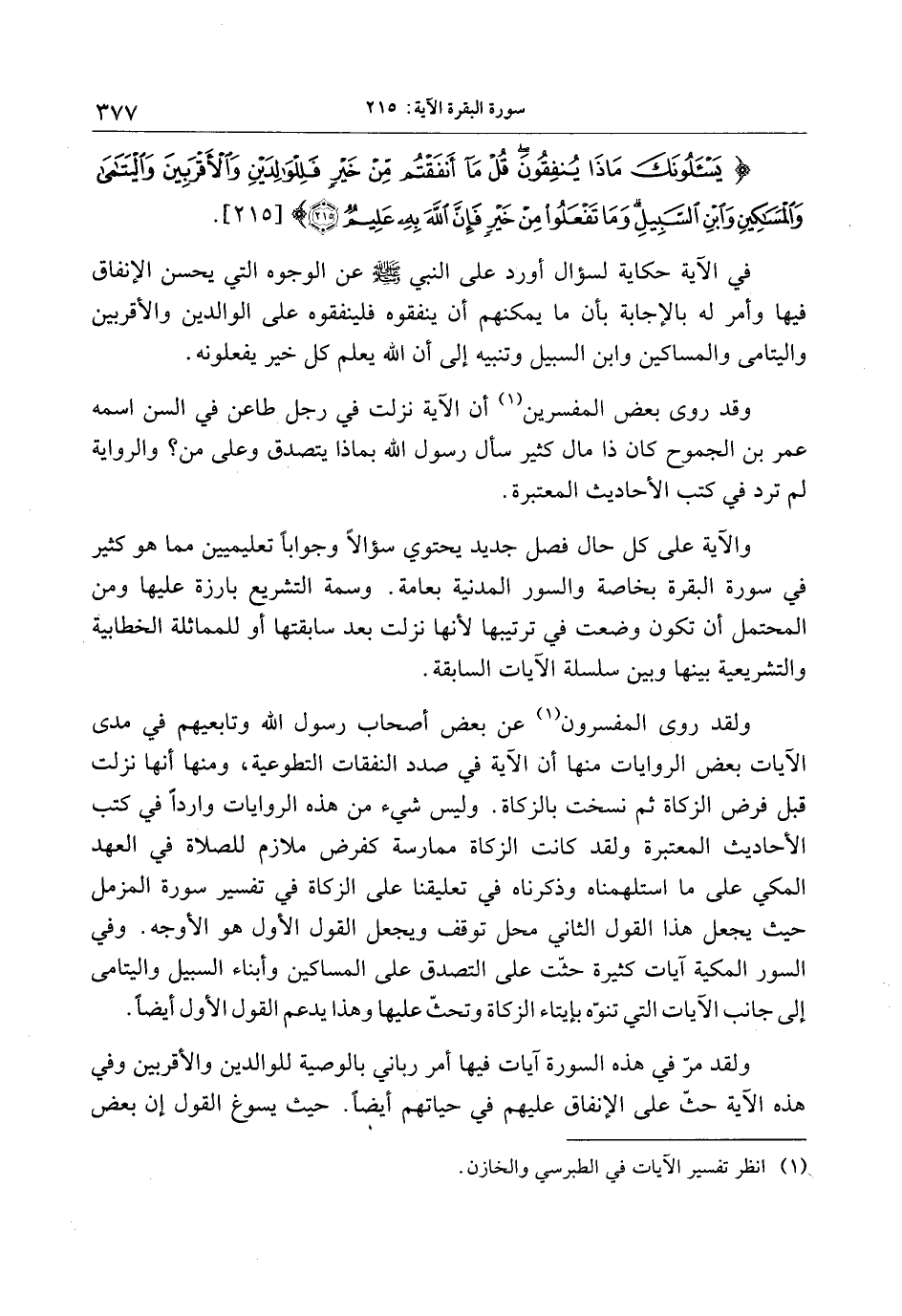 وقد روى بعض المفسرين «1» أن الآية نزلت في رجل طاعن في السن اسمه عمر بن الجموح كان ذا مال كثير سأل رسول الله بماذا يتصدق وعلى من؟ والرواية لم ترد في كتب الأحاديث المعتبرة.