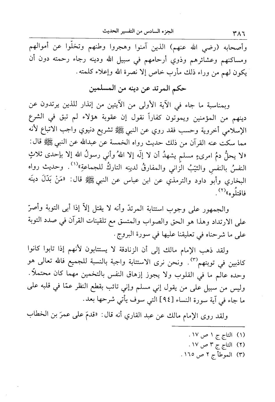 «لا يحلّ دم امرئ مسلم يشهد أن لا إله إلا الله وأني رسول الله إلا بإحدى ثلاث النفس بالنفس والثيّب الزاني والمفارق لدينه التارك للجماعة» «1» . وحديث رواه البخاري وأبو داود والترمذي عن ابن عباس عن النبي صلّى الله عليه وسلّم قال: «من بدّل دينه فاقتلوه» «2» .