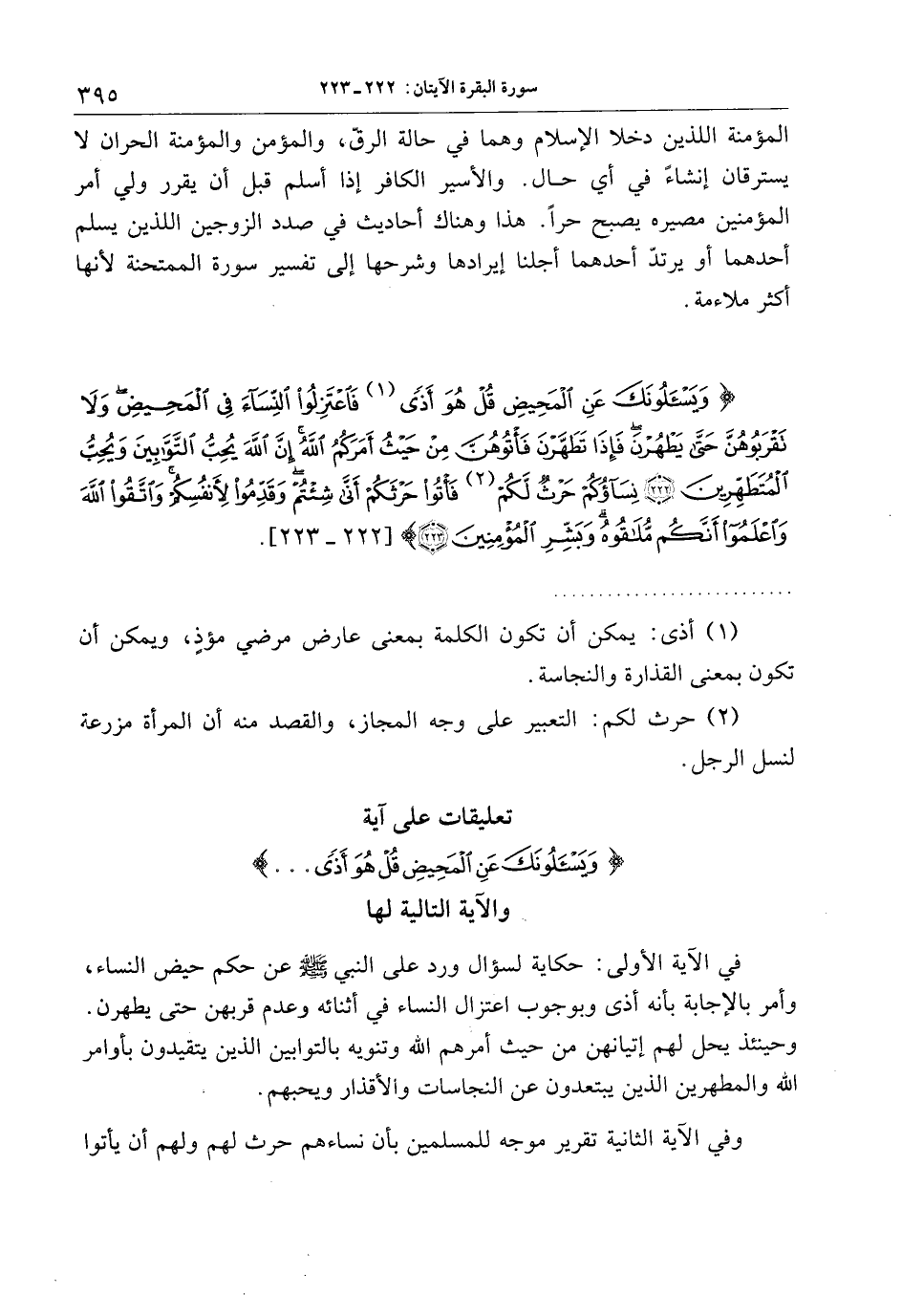 تعليقات على آية وَيَسْئَلُونَكَ عَنِ الْمَحِيضِ قُلْ هُوَ أَذىً ... والآية التالية لها
