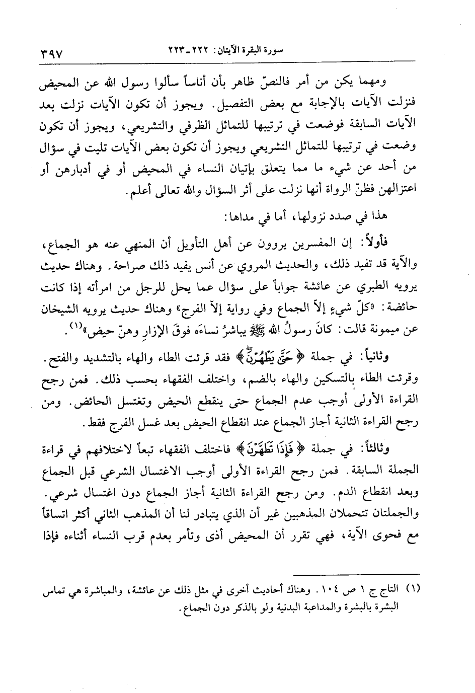 ومهما يكن من أمر فالنصّ ظاهر بأن أناسا سألوا رسول الله عن المحيض فنزلت الآيات بالإجابة مع بعض التفصيل. ويجوز أن تكون الآيات نزلت بعد الآيات السابقة فوضعت في ترتيبها للتماثل الظرفي والتشريعي، ويجوز أن تكون وضعت في ترتيبها للتماثل التشريعي ويجوز أن تكون بعض الآيات تليت في سؤال من أحد عن شيء ما مما يتعلق بإتيان النساء في المحيض أو في أدبارهن أو اعتزالهن فظنّ الرواة أنها نزلت على أثر السؤال والله تعالى أعلم.