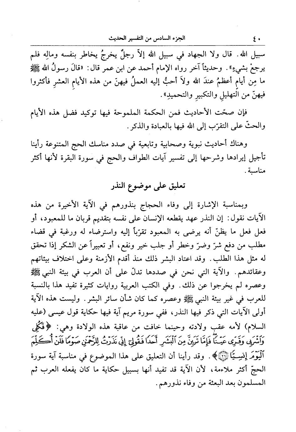 وبمناسبة الإشارة إلى وفاء الحجاج بنذورهم في الآية الأخيرة من هذه الآيات نقول: إن النذر عهد يقطعه الإنسان على نفسه بتقديم قربان ما للمعبود، أو فعل فعل ما يظنّ أنه يرضى به المعبود تقرّبا إليه واسترضاء له ورغبة في قضاء مطلب من دفع شرّ وضرّ وخطر أو جلب خير ونفع، أو تعبيرا عن الشكر إذا تحقق له مثل هذا الطلب. وقد اعتاد البشر ذلك منذ أقدم الأزمنة وعلى اختلاف بيئاتهم وعقائدهم. والآية التي نحن في صددها تدلّ على أن العرب في بيئة النبي صلّى الله عليه وسلّم وعصره لم يخرجوا عن ذلك. وفي الكتب العربية روايات كثيرة تفيد هذا بالنسبة للعرب في غير بيئة النبي صلّى الله عليه وسلّم وعصره كما كان شأن سائر البشر. وليست هذه الآية أولى الآيات التي ذكر فيها النذر، ففي سورة مريم آية فيها حكاية قول عيسى (عليه السلام) لأمه عقب ولادته وحينما خافت من عاقبة هذه الولادة وهي: فَكُلِي وَاشْرَبِي وَقَرِّي عَيْناً فَإِمَّا تَرَيِنَّ مِنَ الْبَشَرِ أَحَداً فَقُولِي إِنِّي نَذَرْتُ لِلرَّحْمنِ صَوْماً فَلَنْ أُكَلِّمَ الْيَوْمَ إِنْسِيًّا (26) . وقد رأينا أن التعليق على هذا الموضوع في مناسبة آية سورة الحجّ أكثر ملاءمة، لأن الآية قد تفيد أنها بسبيل حكاية ما كان يفعله العرب ثم المسلمون بعد البعثة من وفاء نذورهم.