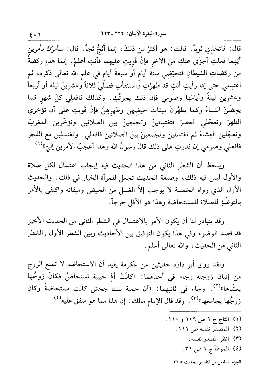ولقد روى أبو داود حديثين عن عكرمة يفيد أن الاستحاضة لا تمنع الزوج من إتيان زوجته وجاء في أحدهما: «كانت أمّ حبيبة تستحاض فكان زوجها يغشاها» «2» . وجاء في ثانيهما: «أن حمنة بنت جحش كانت مستحاضة وكان زوجها يجامعها» «3» . وقد قال الإمام مالك: إن هذا مما هو متفق عليه «4» .