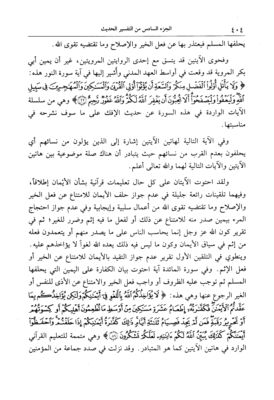 وينطوي في التلقين الأول تقرير عدم جواز التقيد بالأيمان للامتناع عن الخير أو فعل الإثم. وفي سورة المائدة آية احتوت بيان الكفارة على اليمين التي يحلفها المسلم ثم توجب عليه الظروف أو واجب فعل الخير والامتناع عن الأذى للنفس أو الغير الرجوع عنها وهي هذه: لا يُؤاخِذُكُمُ اللَّهُ بِاللَّغْوِ فِي أَيْمانِكُمْ وَلكِنْ يُؤاخِذُكُمْ بِما عَقَّدْتُمُ الْأَيْمانَ فَكَفَّارَتُهُ إِطْعامُ عَشَرَةِ مَساكِينَ مِنْ أَوْسَطِ ما تُطْعِمُونَ أَهْلِيكُمْ أَوْ كِسْوَتُهُمْ أَوْ تَحْرِيرُ رَقَبَةٍ فَمَنْ لَمْ يَجِدْ فَصِيامُ ثَلاثَةِ أَيَّامٍ ذلِكَ كَفَّارَةُ أَيْمانِكُمْ إِذا حَلَفْتُمْ وَاحْفَظُوا أَيْمانَكُمْ كَذلِكَ يُبَيِّنُ اللَّهُ لَكُمْ آياتِهِ لَعَلَّكُمْ تَشْكُرُونَ (89) وهي متممة للتعليم القرآني الوارد في هاتين الآيتين كما هو المتبادر. وقد نزلت في صدد جماعة من المؤمنين