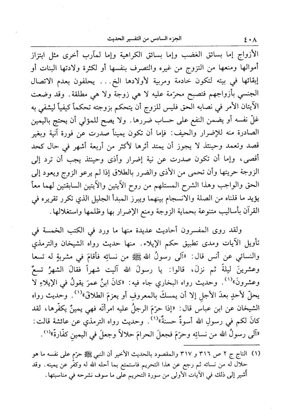 (4) التاج ج 2 ص 316 و 317 والمقصود بالحديث الأخير أن النبي صلّى الله عليه وسلّم حرّم على نفسه ما هو حلال له من نسائه ثم رجع عن هذا التحريم فاستمتع بما أحله الله له وكفّر عن يمينه. وقد أشير إلى ذلك في الآيات الأولى من سورة التحريم على ما سوف نشرحه في مناسبتها.