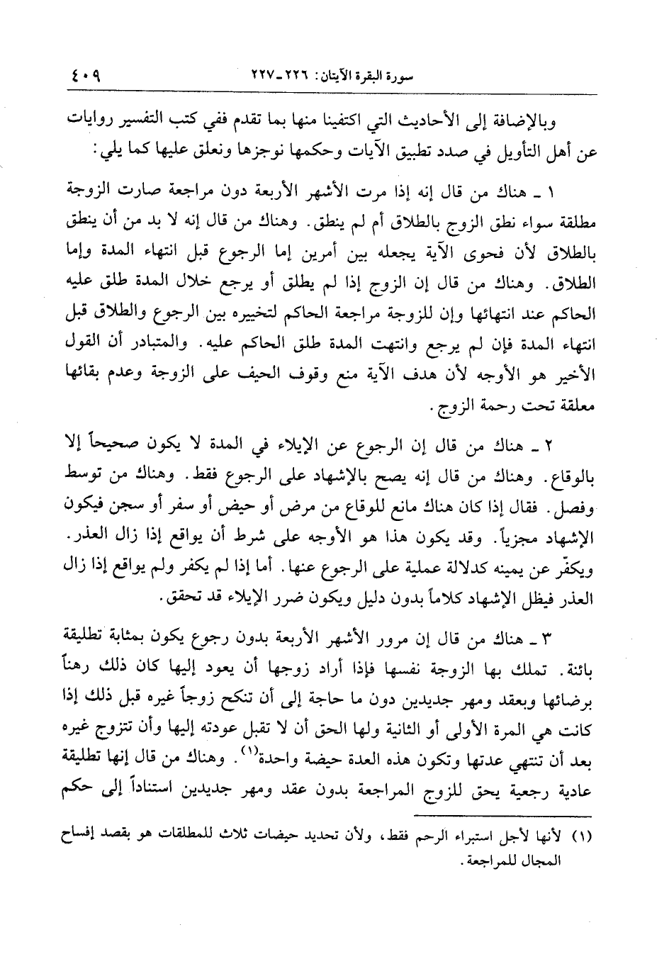 1- هناك من قال إنه إذا مرت الأشهر الأربعة دون مراجعة صارت الزوجة مطلقة سواء نطق الزوج بالطلاق أم لم ينطق. وهناك من قال إنه لا بد من أن ينطق بالطلاق لأن فحوى الآية يجعله بين أمرين إما الرجوع قبل انتهاء المدة وإما الطلاق. وهناك من قال إن الزوج إذا لم يطلق أو يرجع خلال المدة طلق عليه الحاكم عند انتهائها وإن للزوجة مراجعة الحاكم لتخييره بين الرجوع والطلاق قبل انتهاء المدة فإن لم يرجع وانتهت المدة طلق الحاكم عليه. والمتبادر أن القول الأخير هو الأوجه لأن هدف الآية منع وقوف الحيف على الزوجة وعدم بقائها معلقة تحت رحمة الزوج.