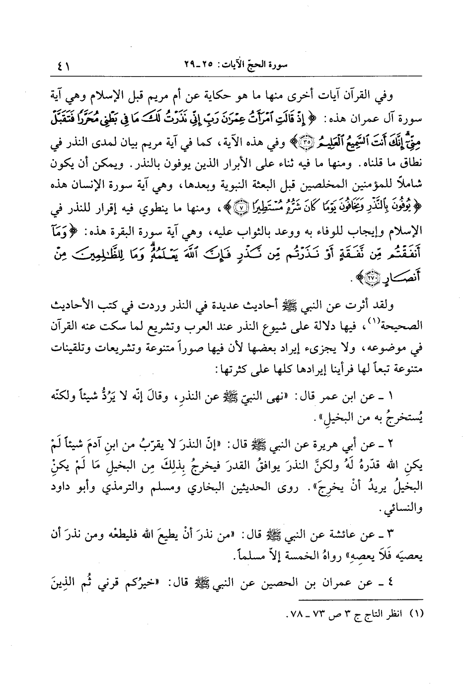 وفي القرآن آيات أخرى منها ما هو حكاية عن أم مريم قبل الإسلام وهي آية سورة آل عمران هذه: إِذْ قالَتِ امْرَأَتُ عِمْرانَ رَبِّ إِنِّي نَذَرْتُ لَكَ ما فِي بَطْنِي مُحَرَّراً فَتَقَبَّلْ مِنِّي إِنَّكَ أَنْتَ السَّمِيعُ الْعَلِيمُ (35) وفي هذه الآية، كما في آية مريم بيان لمدى النذر في نطاق ما قلناه. ومنها ما فيه ثناء على الأبرار الذين يوفون بالنذر. ويمكن أن يكون شاملا للمؤمنين المخلصين قبل البعثة النبوية وبعدها، وهي آية سورة الإنسان هذه يُوفُونَ بِالنَّذْرِ وَيَخافُونَ يَوْماً كانَ شَرُّهُ مُسْتَطِيراً (7) ، ومنها ما ينطوي فيه إقرار للنذر في الإسلام وإيجاب للوفاء به ووعد بالثواب عليه، وهي آية سورة البقرة هذه: وَما أَنْفَقْتُمْ مِنْ نَفَقَةٍ أَوْ نَذَرْتُمْ مِنْ نَذْرٍ فَإِنَّ اللَّهَ يَعْلَمُهُ وَما لِلظَّالِمِينَ مِنْ أَنْصارٍ (270) .