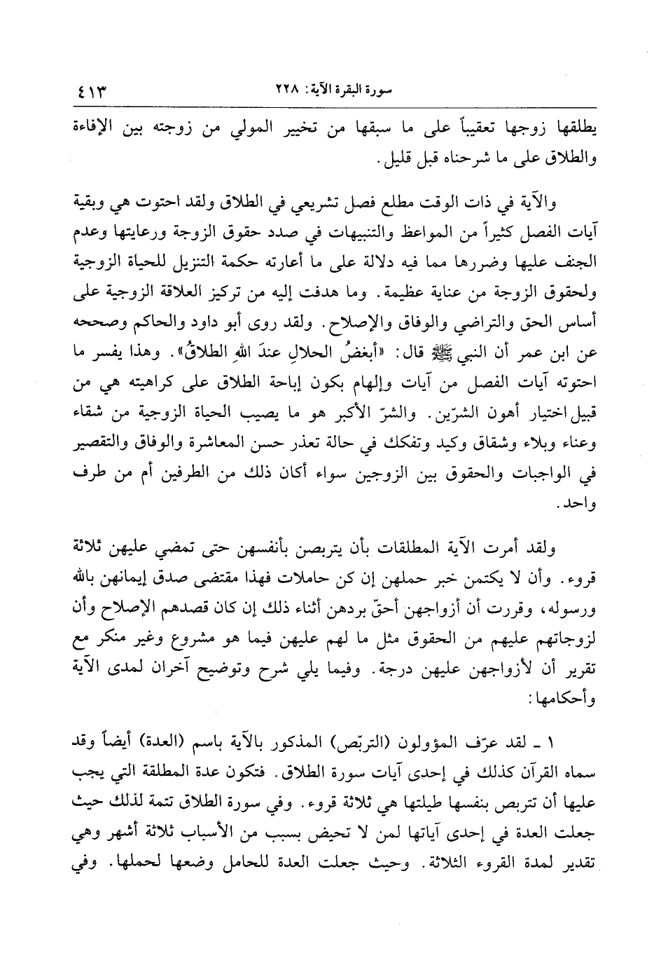 ولقد أمرت الآية المطلقات بأن يتربصن بأنفسهن حتى تمضي عليهن ثلاثة قروء. وأن لا يكتمن خبر حملهن إن كن حاملات فهذا مقتضى صدق إيمانهن بالله ورسوله، وقررت أن أزواجهن أحقّ بردهن أثناء ذلك إن كان قصدهم الإصلاح وأن لزوجاتهم عليهم من الحقوق مثل ما لهم عليهن فيما هو مشروع وغير منكر مع تقرير أن لأزواجهن عليهن درجة. وفيما يلي شرح وتوضيح آخران لمدى الآية وأحكامها: