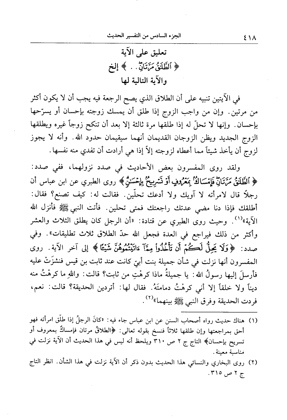(1) هناك حديث رواه أصحاب السنن عن ابن عباس جاء فيه: «كان الرجل إذا طلّق امرأته فهو أحق بمراجعتها وإن طلقها ثلاثا فنسخ بقوله تعالى: الطَّلاقُ مَرَّتانِ فَإِمْساكٌ بِمَعْرُوفٍ أَوْ تَسْرِيحٌ بِإِحْسانٍ التاج ج 2 ص 310 ويلحظ أنه ليس في هذا الحديث أن الآية نزلت في مناسبة معينة.